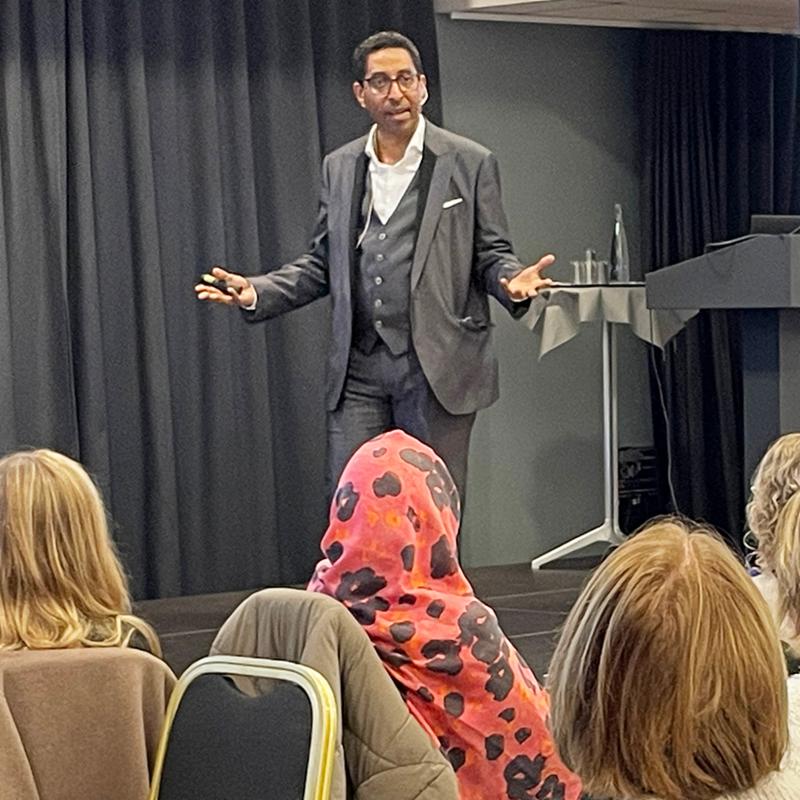 Mann i dress står på scenen, publikum sitter ved bord i forkant