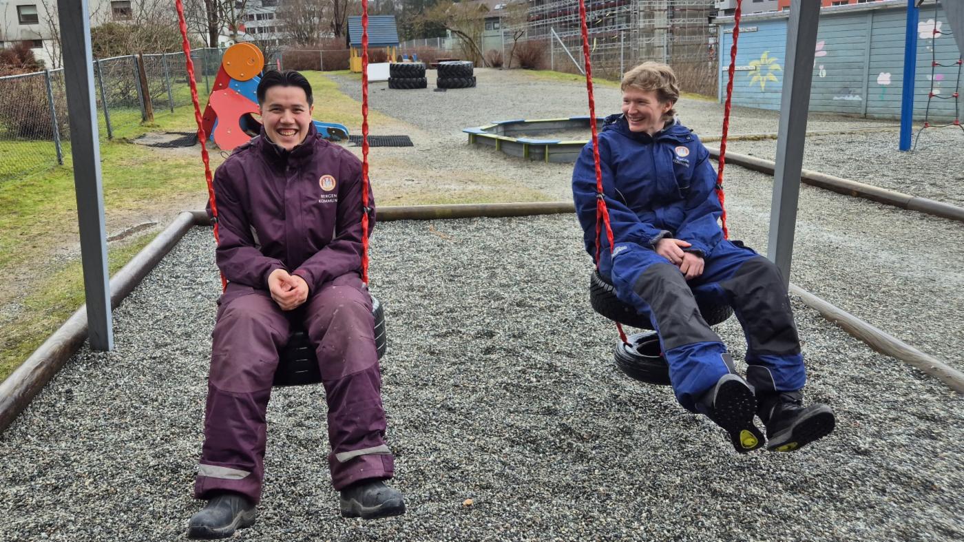 Barnehagelærerne Simen Holm og Thomas Wiik Bjerknes, som begge jobber i Fløenbakken barnehage, er ikke i tvil om hvorfor de valgte yrket.