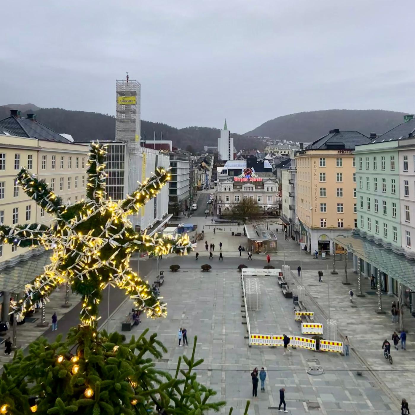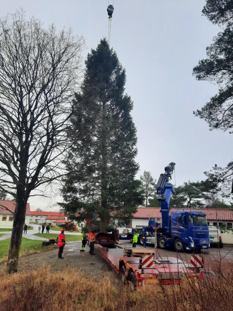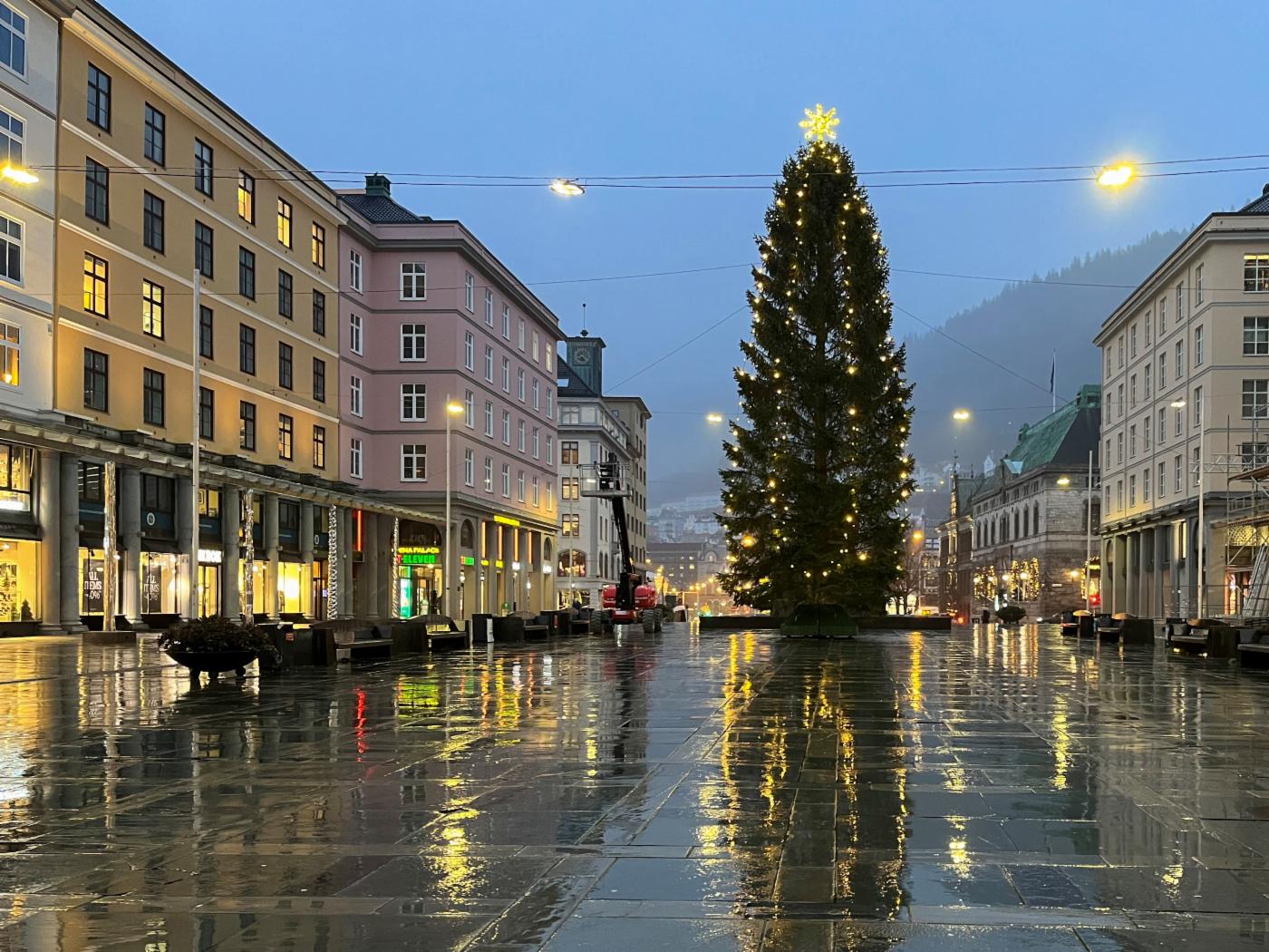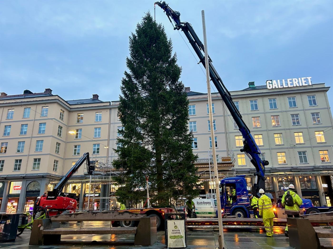Juletreet på Torgallmenningen settes alltid opp uken før den årlige Lysfesten, som i år er 16. november. Granen er på 18 meter, og er en gave fra NLA Høgskolen.