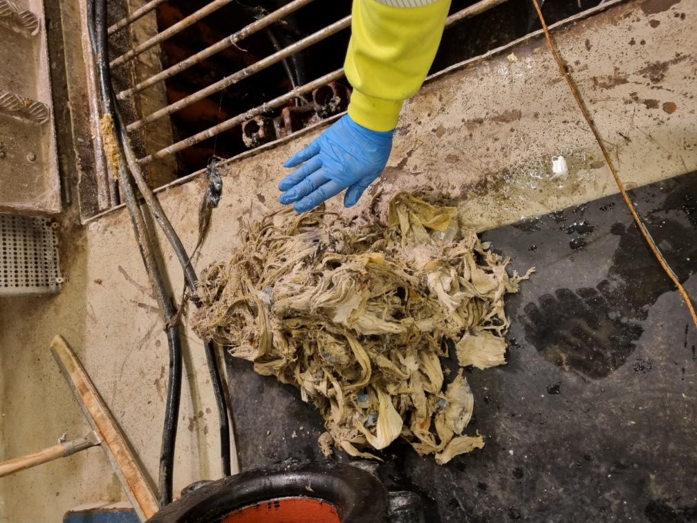 Våtservietter, fiberkluter, bind og tamponger er verstingprodukter når det gjelder å tette pumper og rør. Slikt boss løser seg nemlig ikke opp i vann, men filtrer seg sammen med størknet fett fra matrester og -oljer, og skaper propper harde som betong. Ofte i pumpestasjonene våre, men en propp kan like gjerne dannes rett under boligen din … og da kan du faktisk risikere å få naboen sitt avløp opp i dusjen! DET høres vel ikke fristende ut?