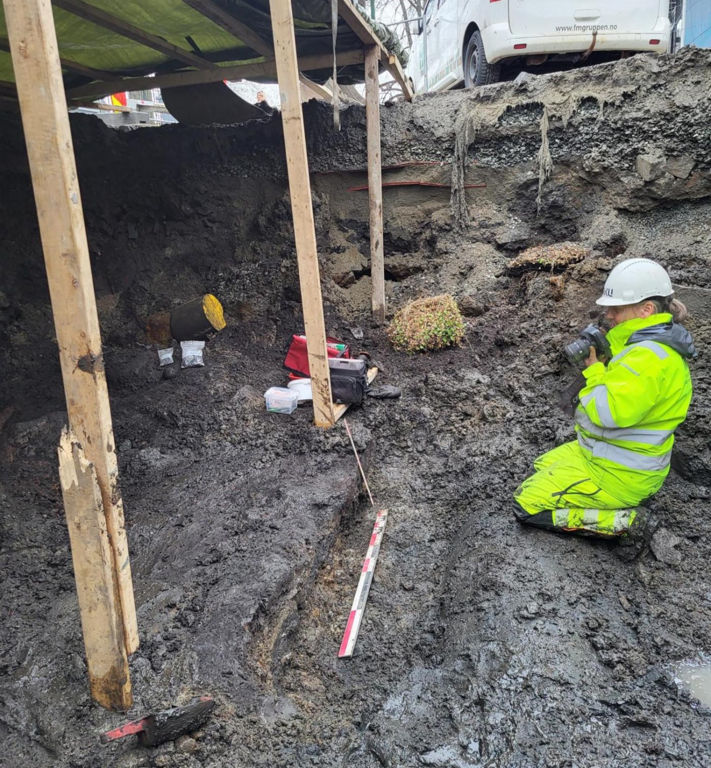 Området de nå arbeider på i krysset Nikolaikirkeallmenningen ligger om lag 2 meter lavere enn dagens veibane. Dette forklarer Mona skyldes at området er blitt bygget opp etter hvert som området har blitt utsatt for branner, men også generell oppbygging av terreng og påvirkning fra bosetting over mange hundre år.