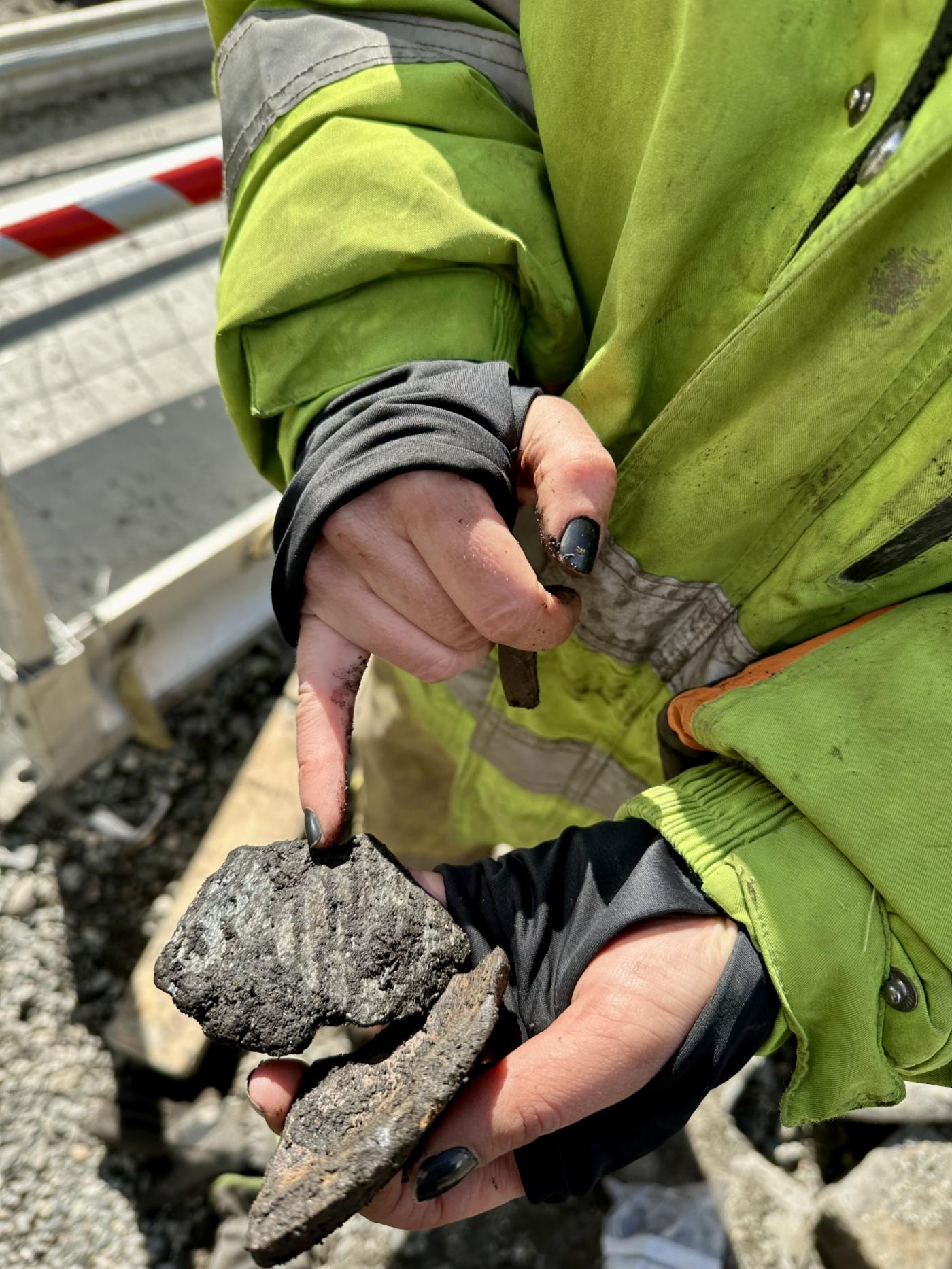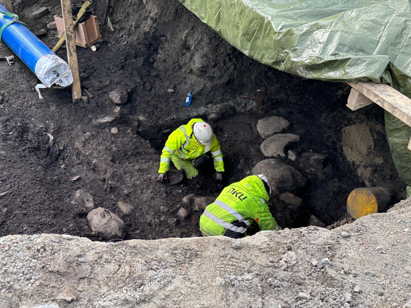 – De gamle rørene som lå her ble lagt ned i 1920-21, og heldigvis for oss ser det ut til at de den gangen for det meste gravde akkurat det de behøvde for å legge ned rørene. Vi har sett flere steder at de gamle rørene ligger direkte oppå middelalderske kulturlag. Derfor finner vi ganske mye intakt selv om det tidligere har vært gravd i forbindelse med moderne infrastruktur som rør og kabler, fortsetter Mona.