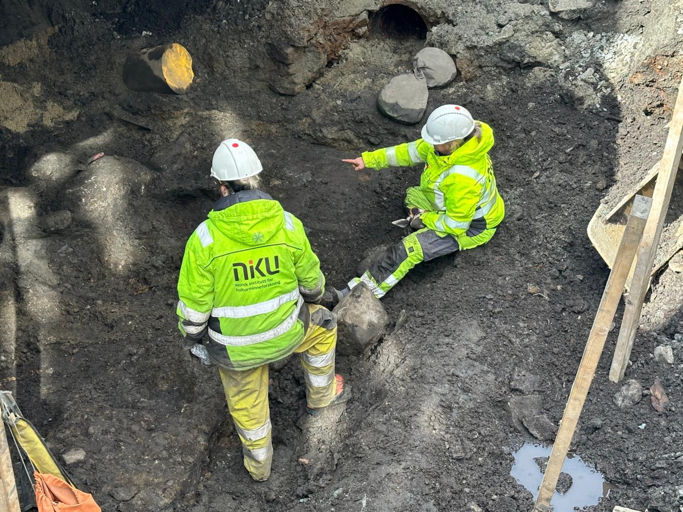 Damene som utfører arbeidet er Mona Karin Boge og Katharina Lorvik. De er arkeologer hos Norsk Institutt for Kulturminneforskning (NIKU), og utfører det spennende oppdraget med arkeologisk overvåking og utgraving av grunnen etter hvert som Bergen Vann sine entreprenører graver seg bortover Øvregaten.