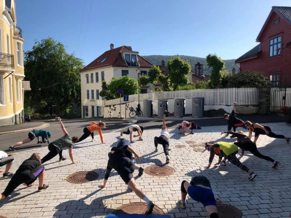 Gym i gaten startet under korona, da treningssentrene var stengt. To frivillige damer i nabolaget tok initiativ til å samle folk til utetrening i gaten, og det har de fortsatt med. Det som først var et midlertidig tiltak, er nå blitt en fast tradisjon tre ganger i uken, med alt fra åtte til tretti deltakere på hver trening.
