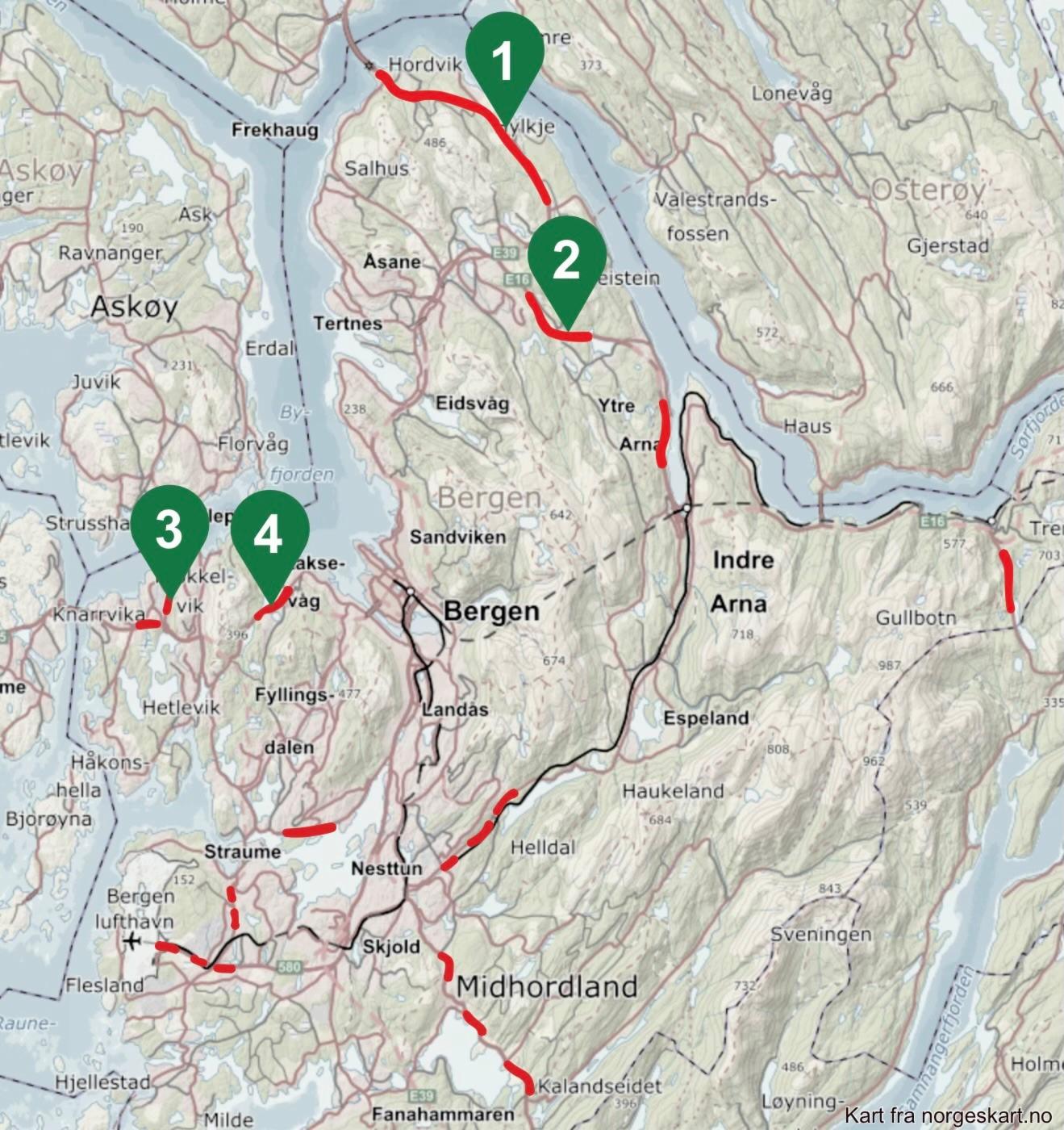 I Bergen er det enkelte strekninger som er mer utsatte enn andre. På kartet nedenfor ser du fire områder med høy risiko for viltpåkjørsler: