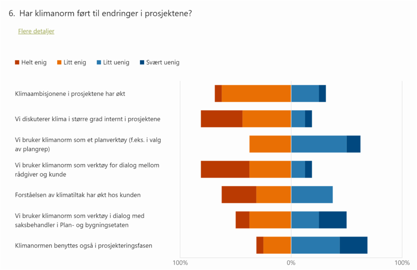 Spørreundersøkelsen viser i hovedsak at respondentene i stor grad mener at både veilederen og regneverktøyet er brukervennlig og enkelt å forstå. Svarene viser samtidig at de fleste bruker klimanorm som er verktøy i dialog med kunden og at forståelsen av klimatiltak har økt. Plan- og bygningsetaten er svært fornøyd med hvordan bransjen har tatt imot verktøyet og fulgt opp med å øke sine klimaambisjoner.