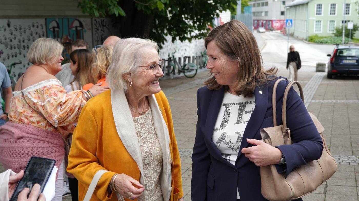 SØSTEREN: Åse Bjerke, søsteren til Knut Bjerke, var med under åpningen og hilste på Christine Kahrs, byråd for byutvikling.