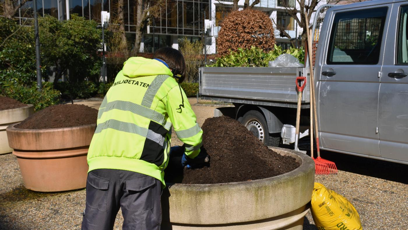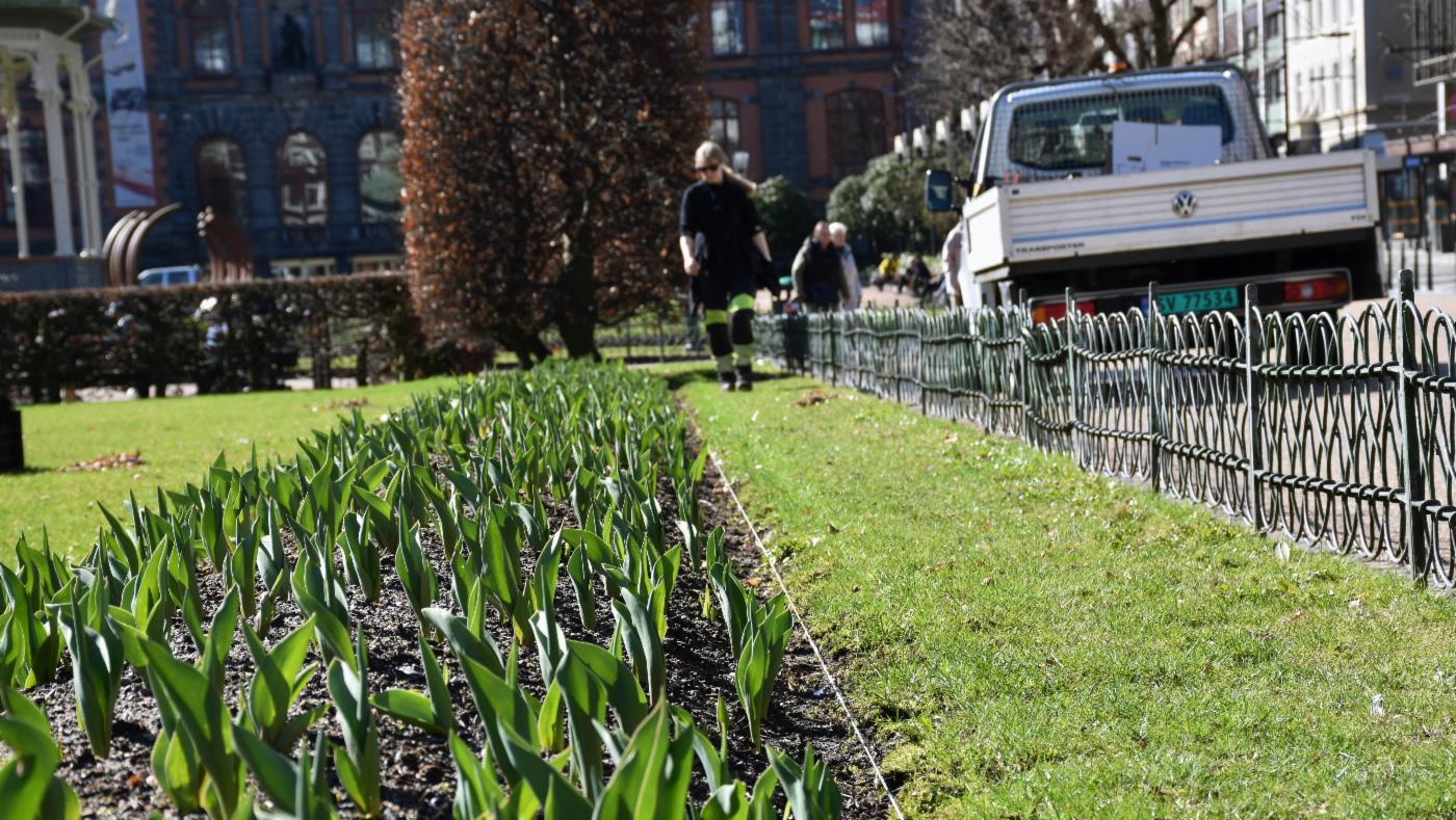 – Det er cirka 18.600 vårplanter som skal i jorden, hovedsakelig forglemmegei og stemorsblomster, og noen tusenfryd. Disse plantes mellom vel 30.000 tulipaner og annen løk som ble satt i høst, forteller Trude Jordal, leder for Utedrift i Bymiljøetaten i Bergen kommune.