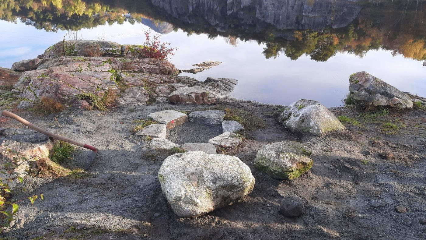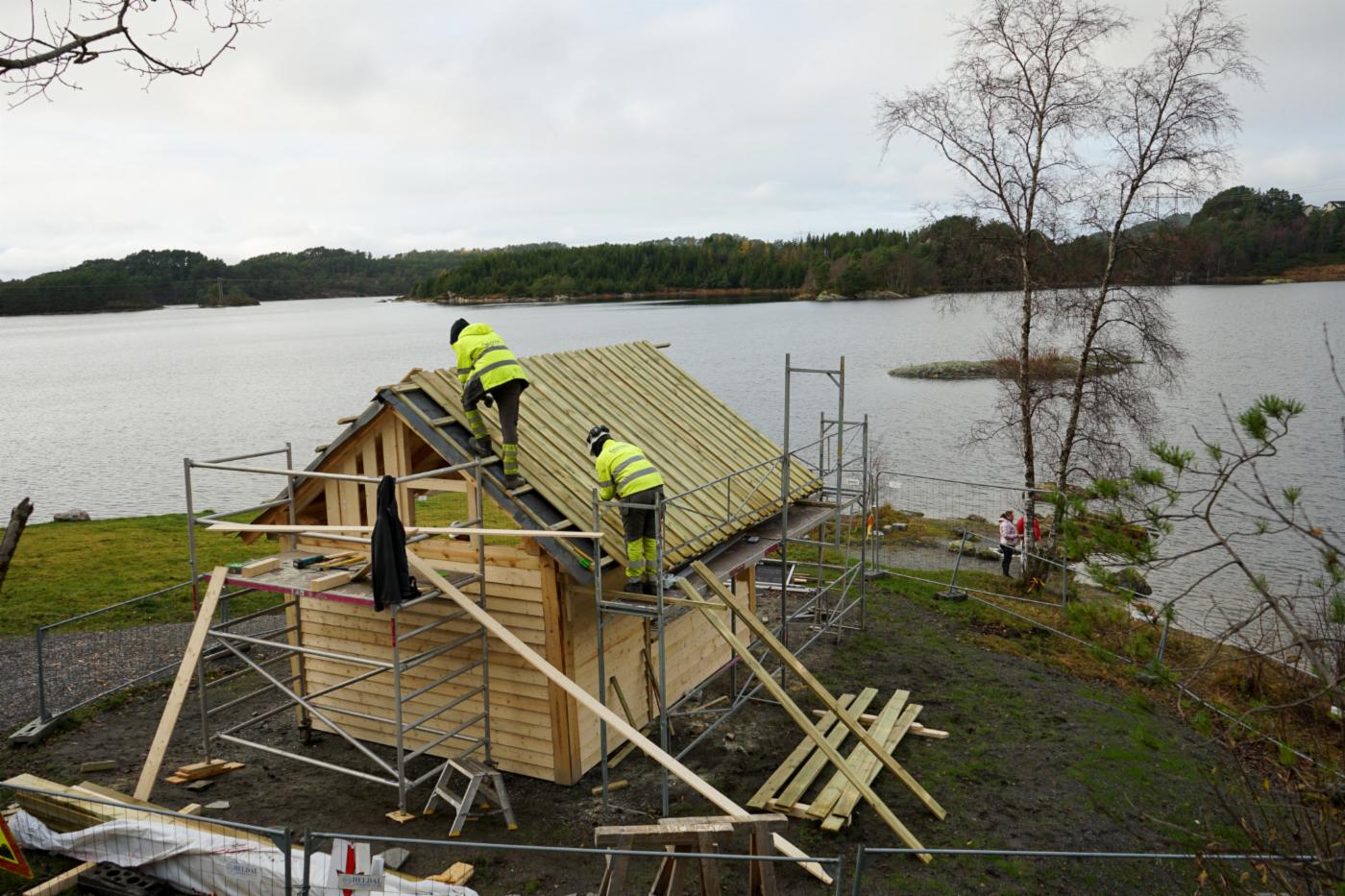 Entreprenør Gravdal Hage og Anlegg har lagt tak og kledning på bygget. Nå skal de bygge benker og bord, samt beise bygget. De står også for steinarbeidet med bålplassen og sittesteinene i terrenget.