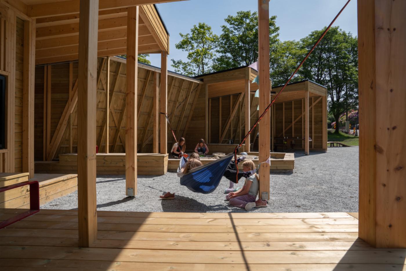 - Lek og avslapning: her finner du sandbasseng, lekehus, sykkelramper, balansestubber, grillplass, langbord og en stor hengekøye. Samlingsplassen er universelt utformet for at alle skal kunne bruke området.