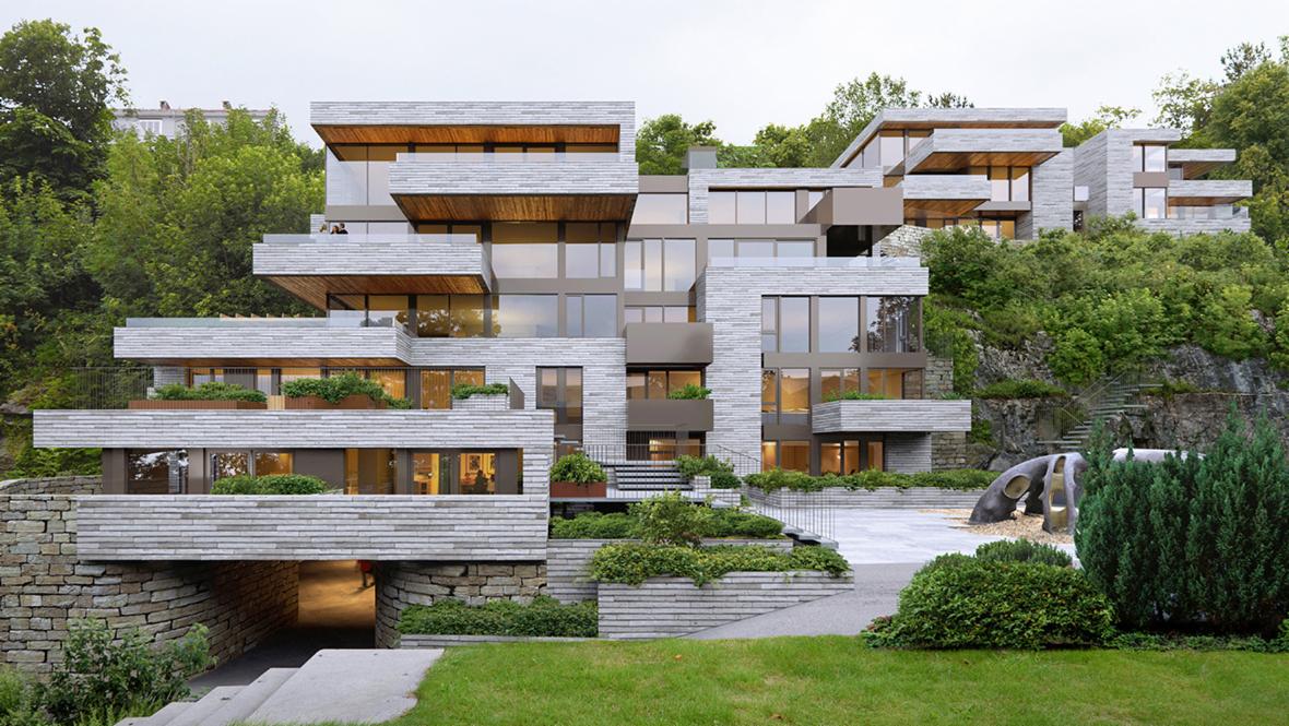 Bellevue 2. Boligprosjekt med 16 leiligheter fordelt på to bygg. Arkitekturen er inspirert av områdets karakteristiske forstøtningsmurer i naturstein i basen Over basen har bygget en klar horisontal struktur av skiver av tegl som krager ut over og griper inn i den grønne fjellsiden, og slik vever bygg og natur sammen. Det er etablert en gjennomgang som følger terrenget, denne gir tilkomst fra oversiden til nedsiden av bygget og inviterer til opphold på tilgjengelige felles takhager med gode sol og utsiktsforhold. I prosjektet er det forsket på konstruksjonsprinsipper for bygging på bratte rest- tomter, hvor bygg og uteplasser er vevet sammen i en sammenhengende struktur, med materialer tilpasset sted og vær.