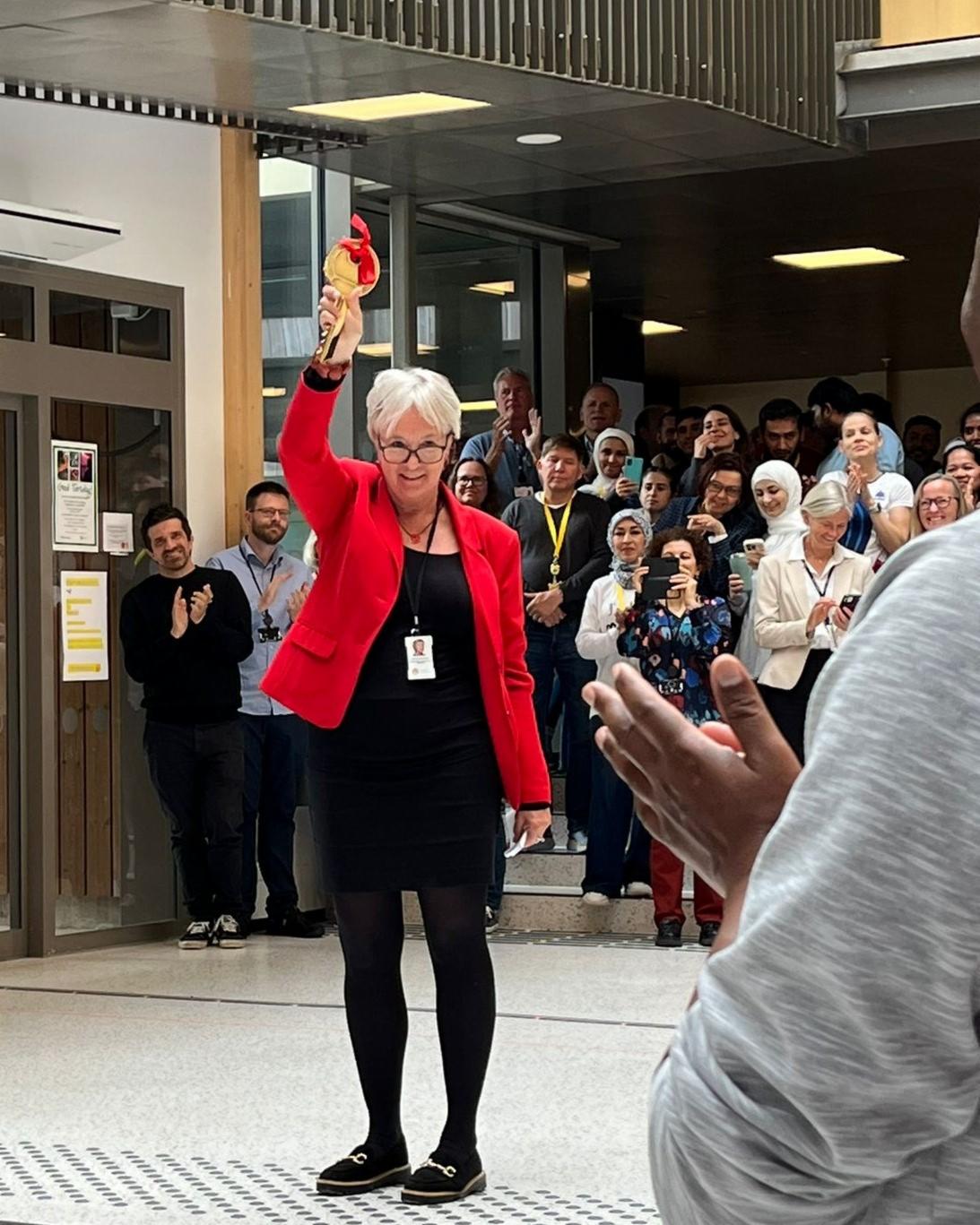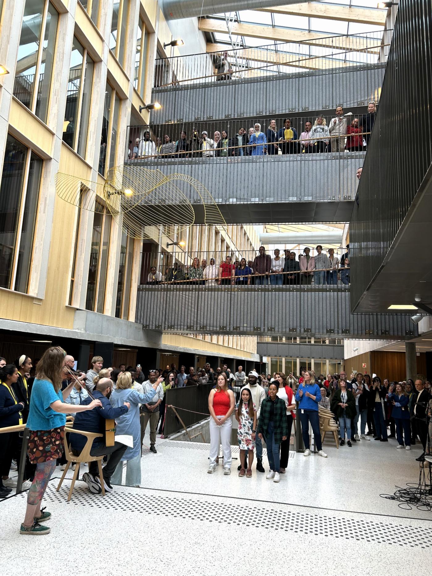 På broene som binder de ulike delene av bygget sammen sto deltakere fra Bergen Læringssenter for norsk og samfunnskunnskap. Da de stemte i med Lillebjørn Nilsens “Barn av regnbuen” var det flere som måtte tørke en tåre.