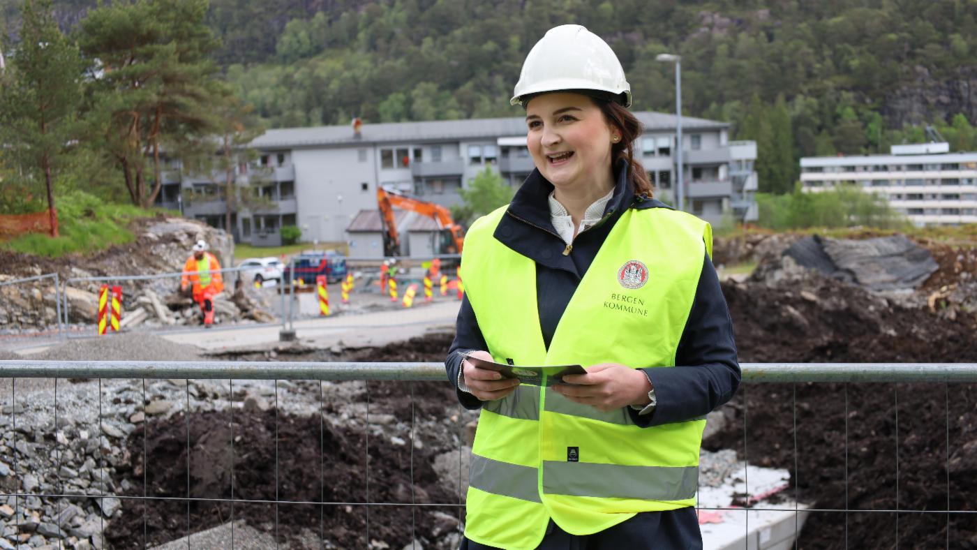 Byråd for eldre, helse og omsorg, Marte Monstad, markerte byggestart for Loddefjordåsen behandlingssenter med å fyre av en av de første salvene på byggeplassen. Det nye behandlingssenteret er planlagt ferdigstilt i juni 2028.