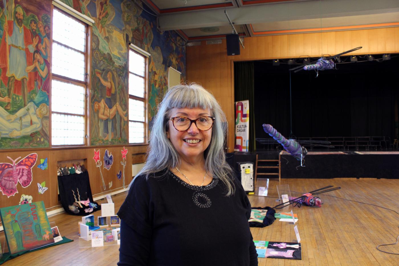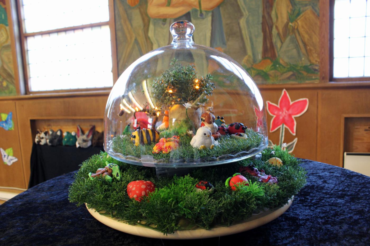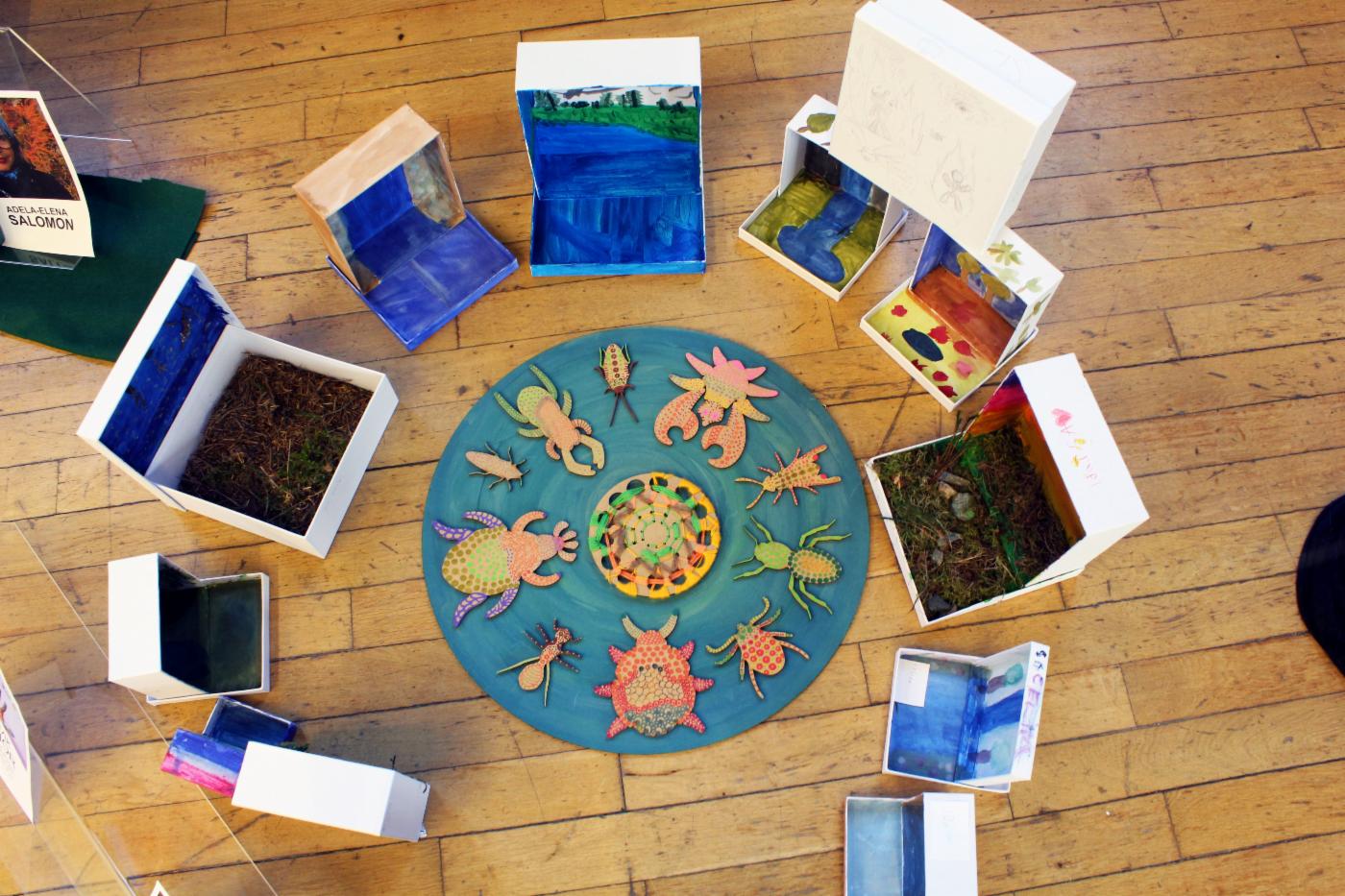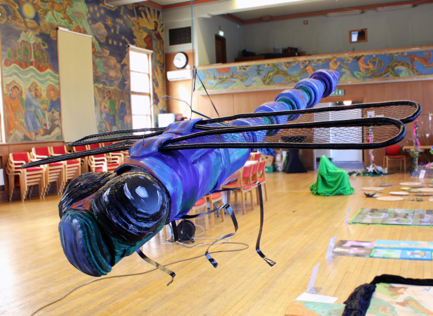 Spredt ut over salen i kulturhuset finner vi både insekter, dyr, mose og trær i ulike former og fasonger. Fra taket henger det gigantiske øyenstikkere. På gulvet ligger det et insekt som “summer” høyt og kvepper oss når vi kommer i nærheten av det.