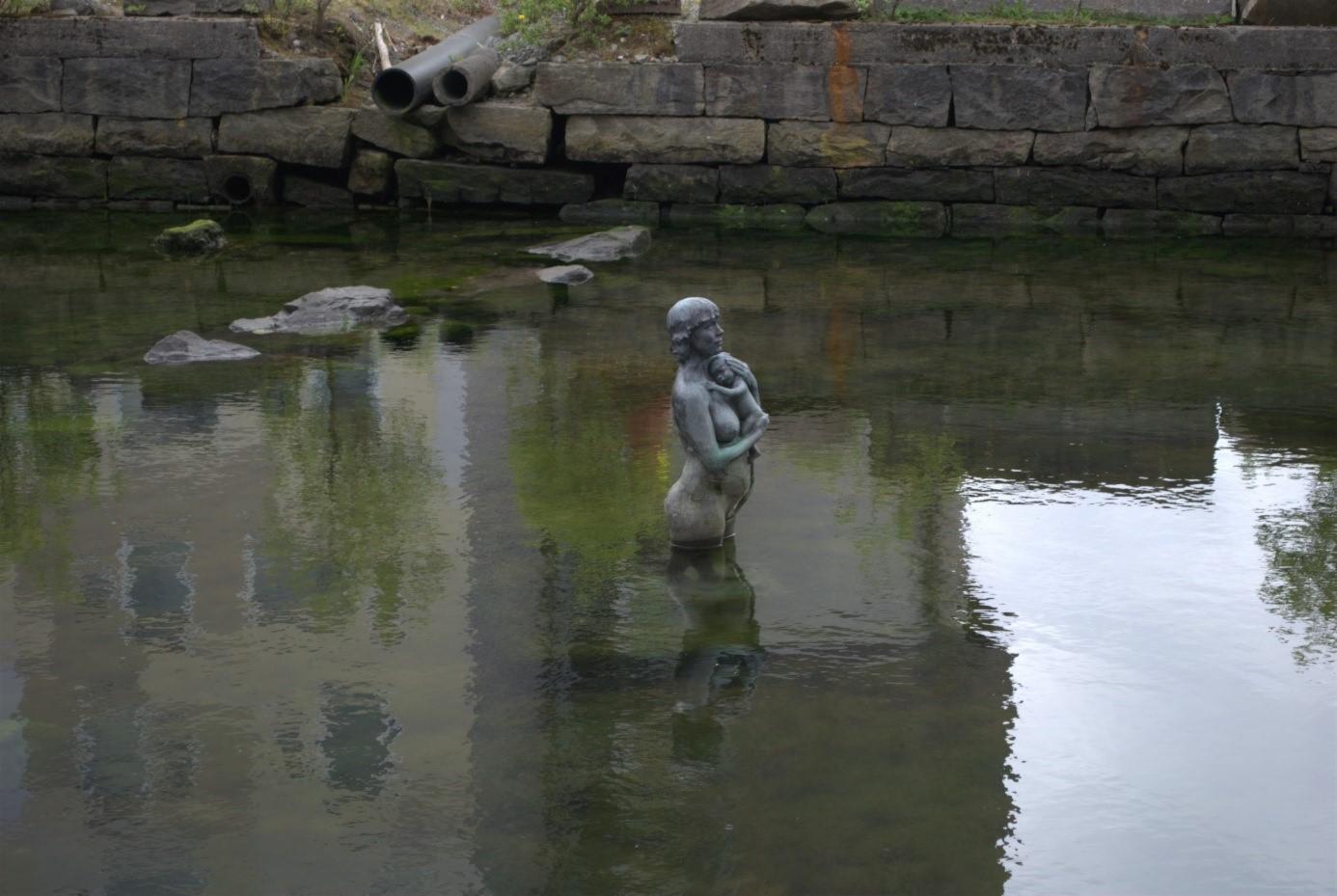 En av de mer fantasifulle plasseringene av Bergen kommunes skulpturer finner vi i Møllendalselven. Midt uti vannmassene står en kvinne som bærer et barn i armene. Hva i alle dager har hun der å gjøre?