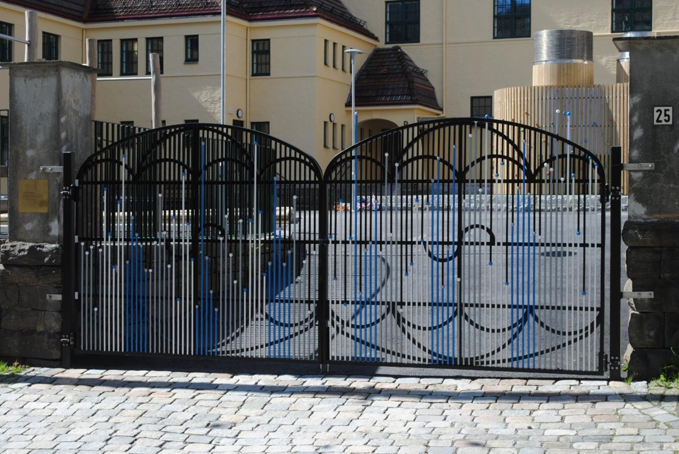 Kunstneren Bjørn-Kowalski Hansen (1979- ) gjøv løs på oppdraget med å skape en ny jernport til den over 100 år gamle skolen. Det er en intellektuell tvist i dette kunstverket. Porten består av 100 staver i ulike lengder. Lengden på stavene tilsvarer nedbørsstatistikken fra Bergen de siste 100 årene. Man kan i tillegg ane omrisset av paraplyer på porten, som kan oppfattes som et lite hint om hva statistikkstavene skal bety.