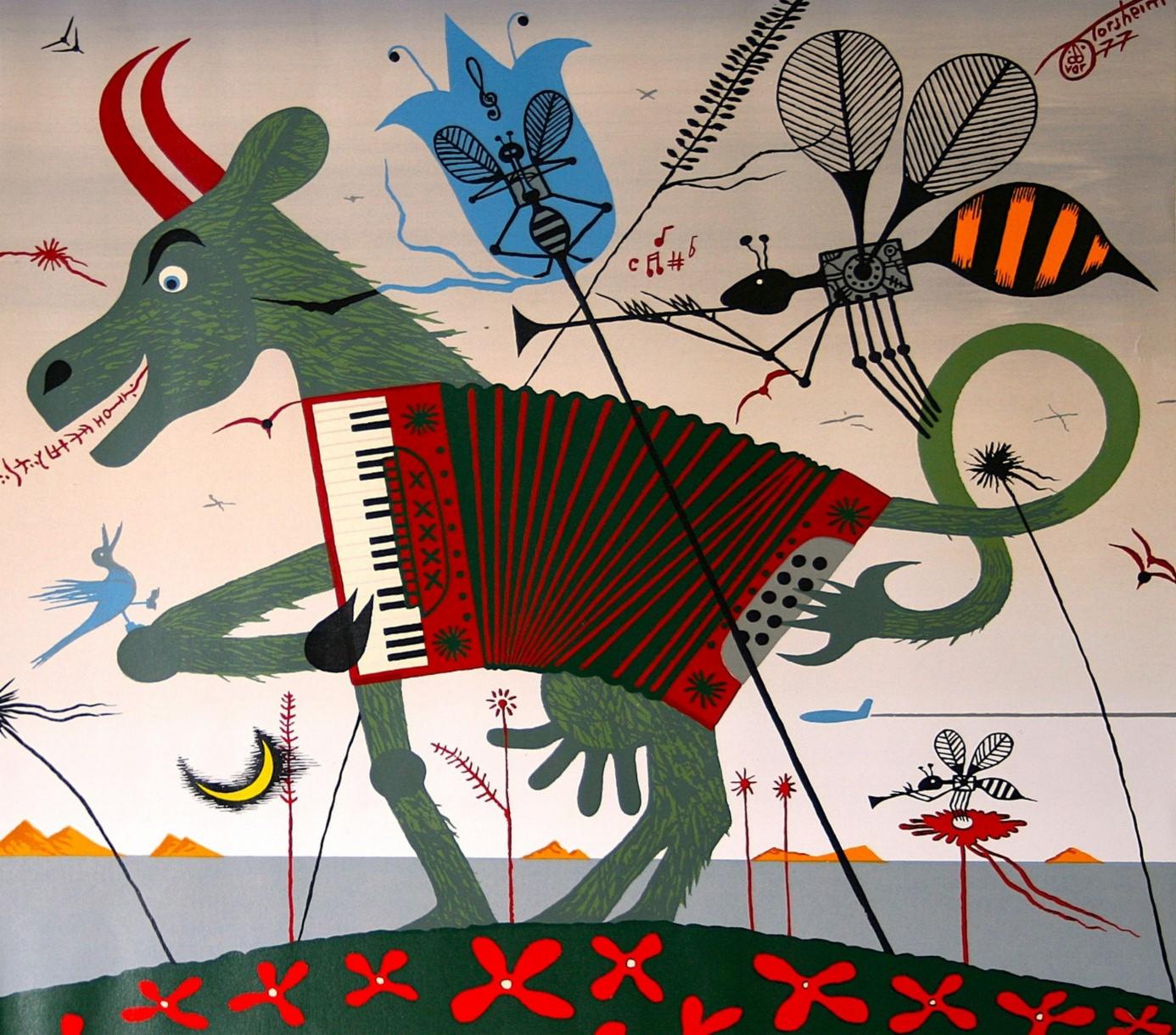 Torsheim leker seg med farger og former i kunsten sin. Veldig ofte benytter han seg av humor som dekker over ramsalt kritikk av samfunnet. Dette tango-bildet kan man studere dag etter dag, uke etter uke, og så plutselig oppdager man nye ting.