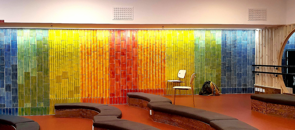 Per Lysgaards (1958- ) “Regnbølge” er et keramikkrelieff og er brent med fargelysende glasur. Kunstverket dekker en sidevegg i skolens amfi og fortsetter videre inn i kantinen. Kunstneren leker seg når han viser sammenhenger mellom bølgelengder og de fargene vi ser. Rødt har den lengste bølgelengden og blå den korteste.
