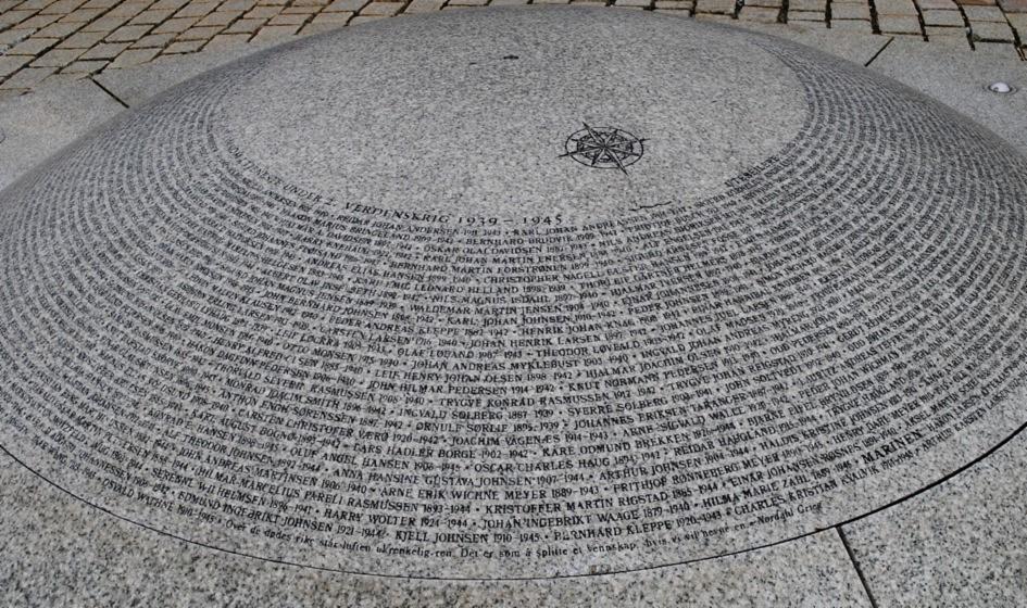 Omgitt av sjø og båter står Shetlands-Larsen ved roret og fører sin skøyte trygt mot land. Rett foran ham stiger en halvkule opp fra bryggen. Linje etter linje med svarte bokstaver og tall snor seg rundt steinen. Det er minnesmerket Nordstjernen som er plassert her. Bokstavene utgjør navnene til de 514 sjøfolkene fra Bergen som ikke kom hjem fra sjøen etter andre verdenskrig.