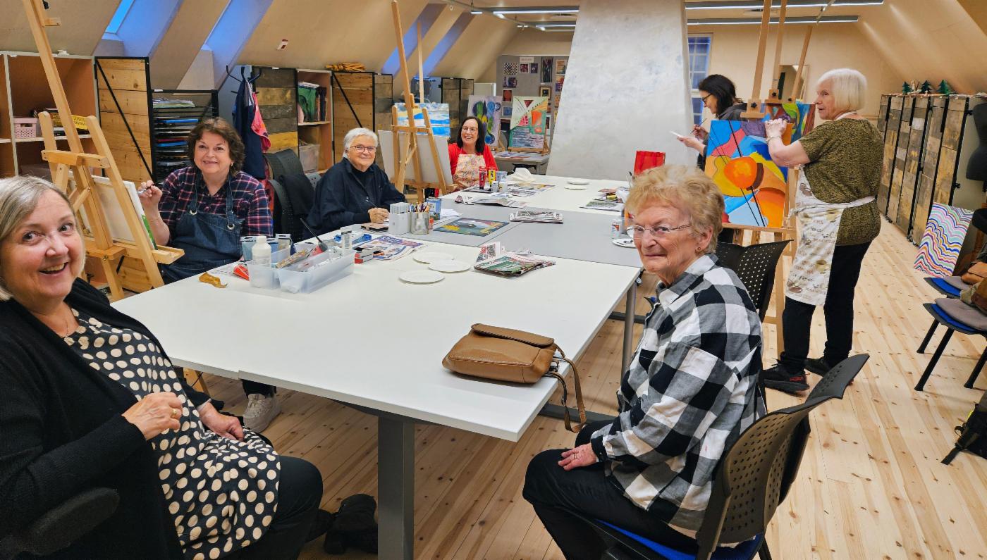 Eli forteller at hun de siste ukene har vært vikar på Birgiths onsdags-malegrupper, og at hun selv arrangerer malekurs på mandager – dette er et kurs i regi av Hieronymus. Selv om Eli egentlig er gått av med pensjon, er hun fortsatt en stor ressurs for kulturkontoret og en dyktig og inspirerende instruktør for maleglade. Dette semestret er kun damer påmeldt kursene, men menn kan selvsagt også melde seg!