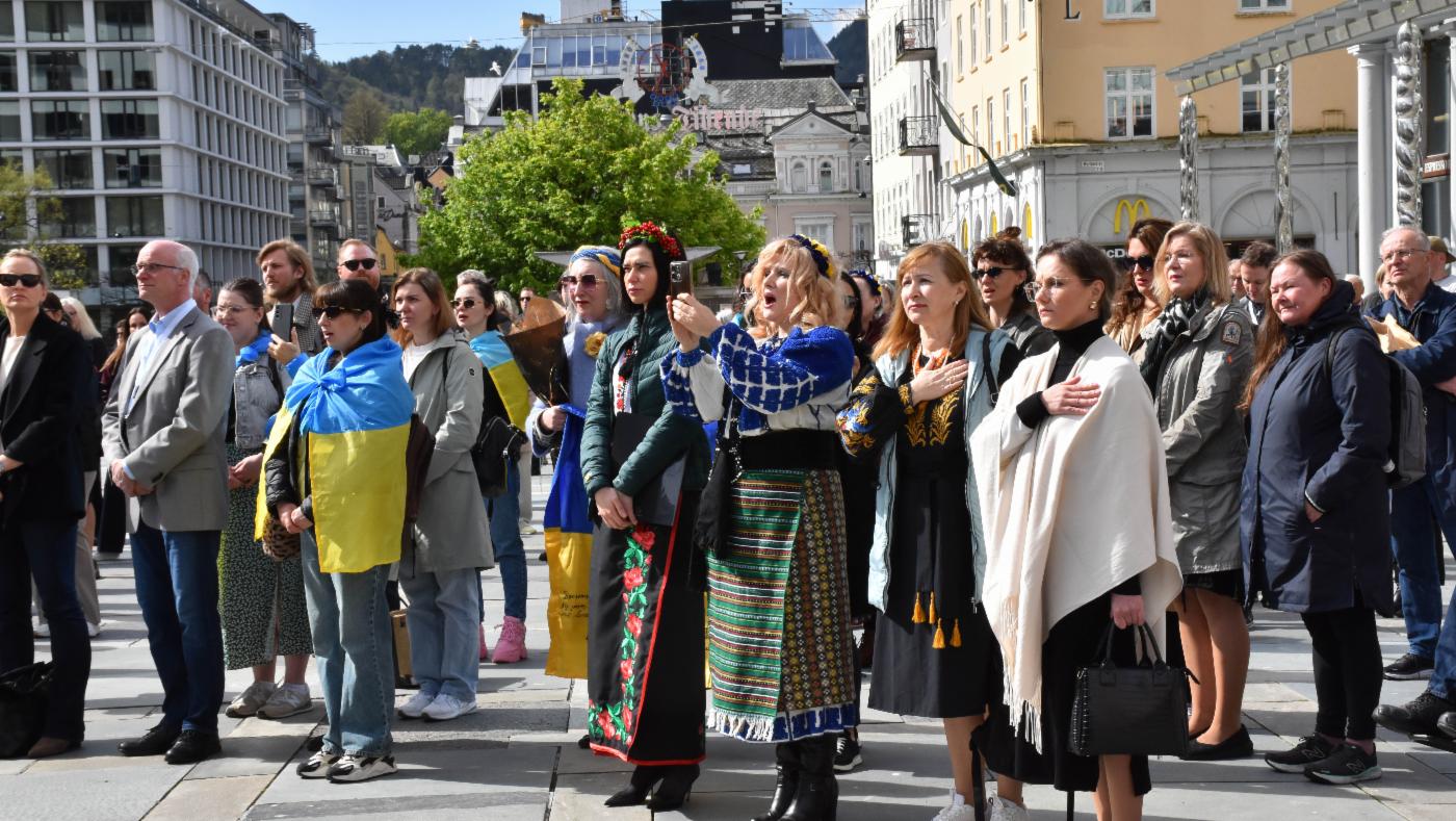 Sangen fra det ukrainske koret Kvitka Dushi kledd i nasjonaldrakter åpnet solidaritetsmarkeringen onsdag. Plassen fremfor scenen på Torgallmenningen var fylt av folk som ville vise sin støtte til det ukrainske folk.