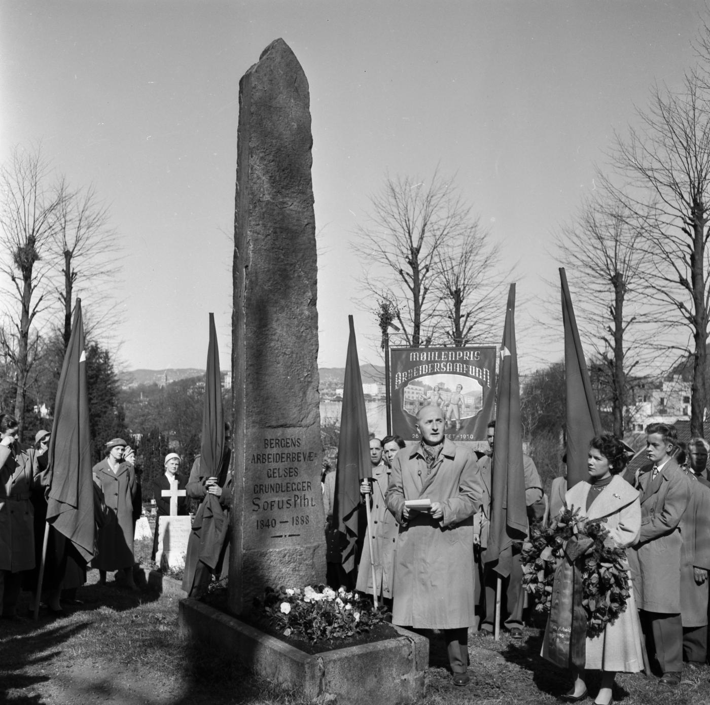 Det ene bildet er fra Møllendal kirkegård, og viser ordfører i Bergen Knut Tjønneland (A) som holder tale ved Sofus Phils grav. Phil var grunnleggeren av arbeiderbevegelsen i Bergen.