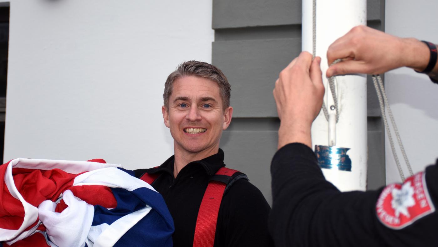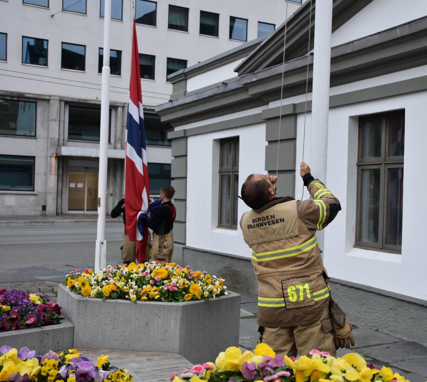 – Akkurat nå firer vi flaggene utenfor Det gamle Rådhus. Det er viktig at vi flagger i bybildet, og brannvesenet har oppgaven med å flagge på kommunens offisielle stenger. Vi heiser flaggene klokken 07.00 og tar de ned igjen før klokken 21.00.