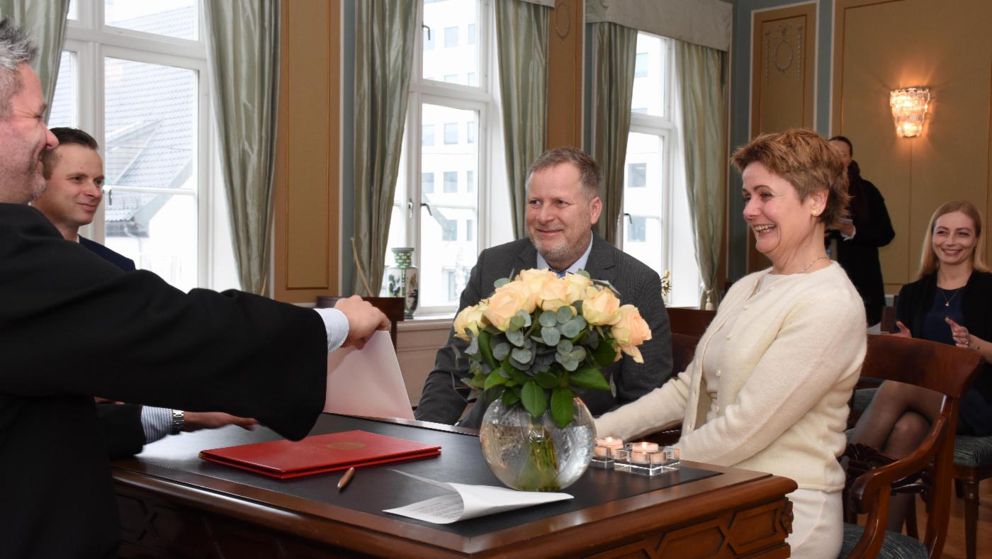 – Vi er begge godt voksne og har vært gift før, så vi hadde ikke behov for noe stort bryllup. Folmann synes likevel det blir mer forpliktende med giftemål, og synes seansen var rørende. At det ble skuddårsdagen var litt mer tilfeldig.