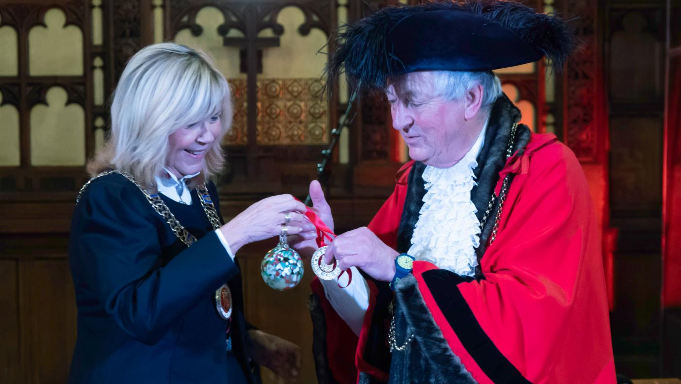 Ordføreren overrekker julepynt til ordføreren i Newcastle