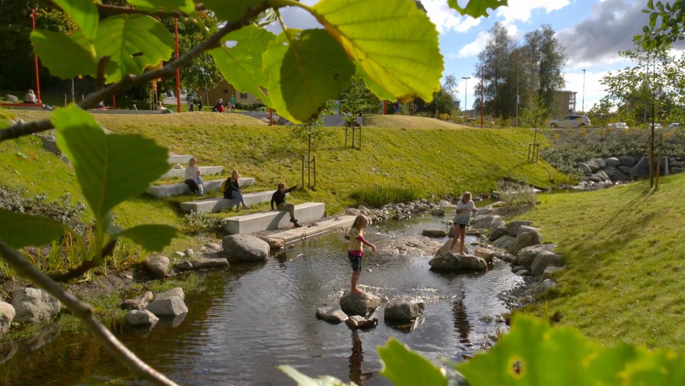 Med få og målrettede inngrep i den eksisterende landskapssituasjonen skapt en variasjon og en opplevelsesrikdom med elementer som bekkeåpningen, skate-banen, bryggen og bålplassen.