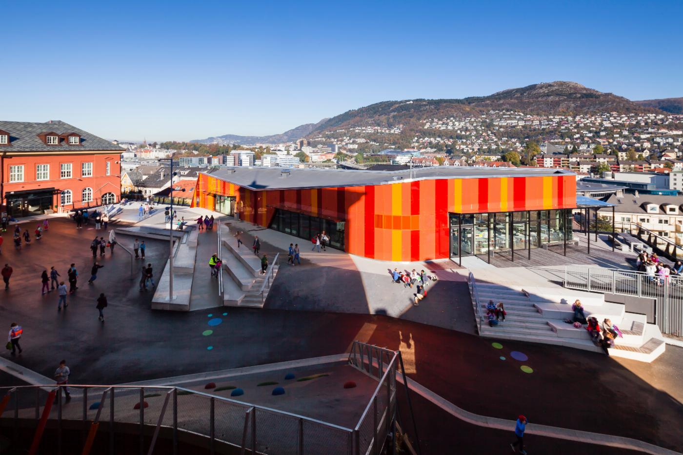 De store nye arealkrevende funksjonene som kultursal og idrettshall er lagt delvis på og under bakken. På taket til idrettshallen, som er den gamle skoleplassen, er det laget et helt nytt urbant landskap med store amfi, klatre- og lekevegger, skatemulighet og godt integrerte lekeapparat og vannrenner der en kan leke med overvann. Det nye landskapet fremstår som plastisk og formbart, og arkitekten beskriver det som en tynn hud som er strukket over den nedsenkede idrettshallen.