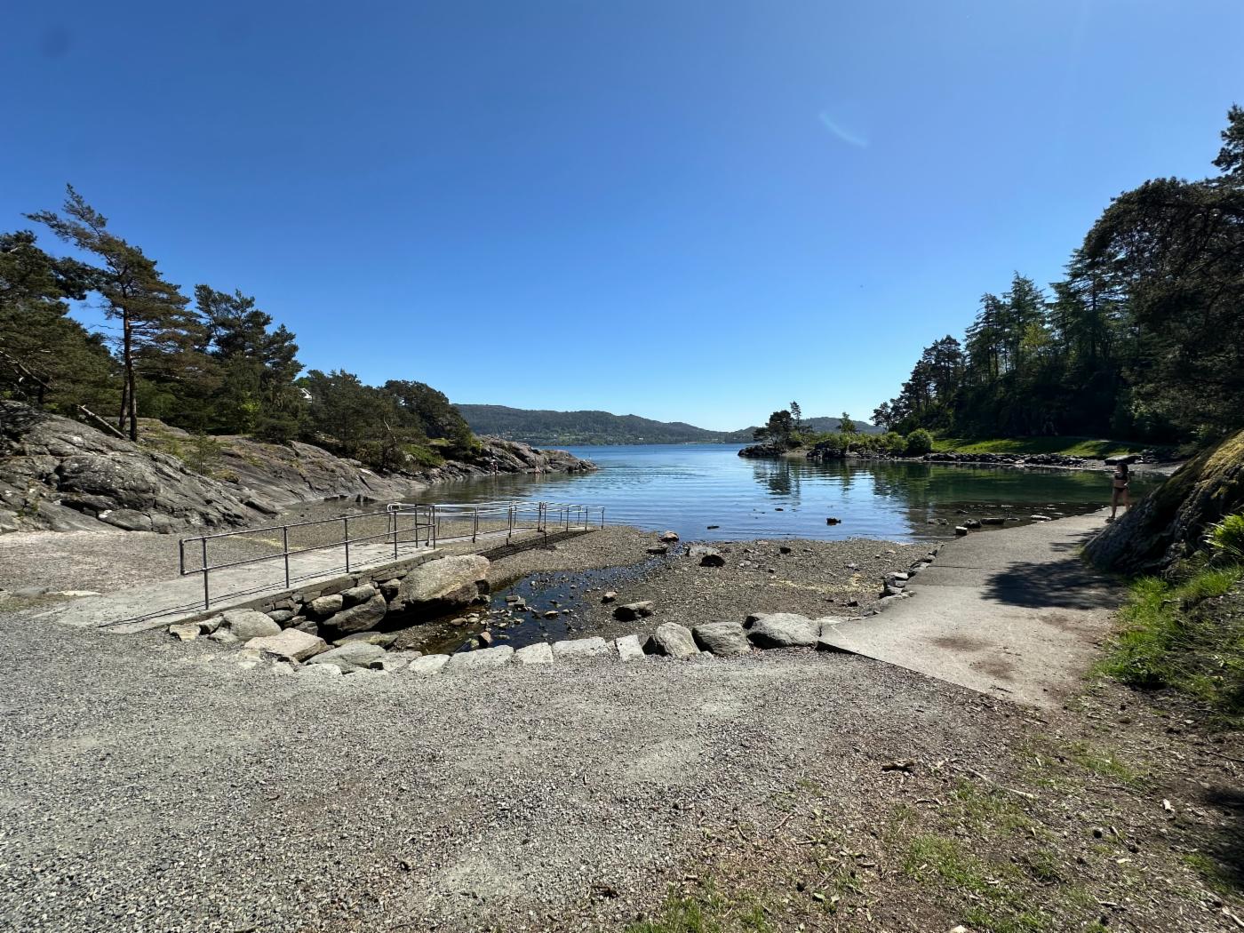 Etter en tur gjennom flotte Arboretet kommer du til denne svært populære badeplassen mot Fanafjorden. Barnevennlig, med sandstrand, stupebrett og stor gresslette. Tilrettelagt for bevegelseshemmede med baderampe.