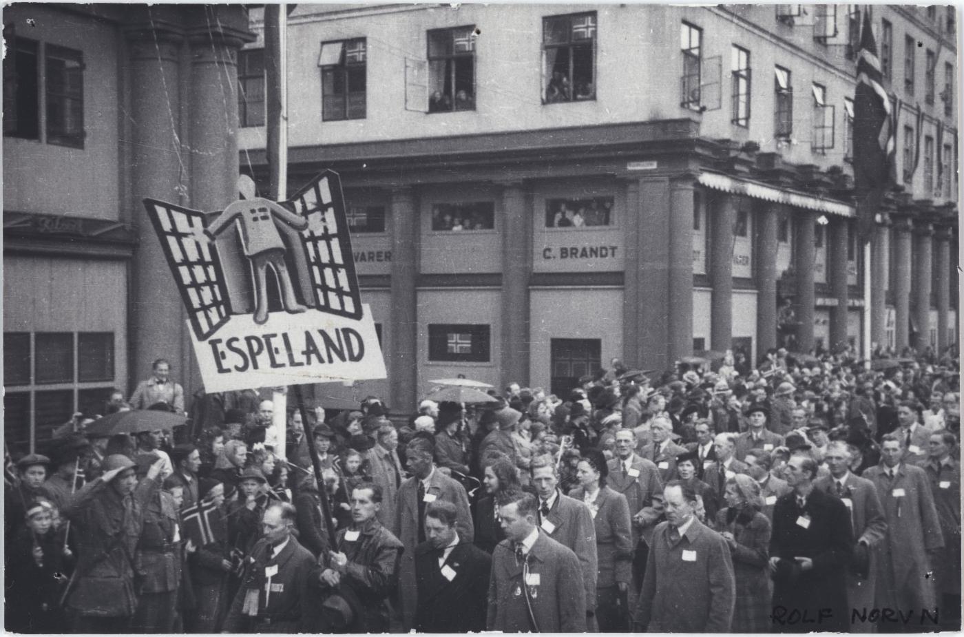 "Da gikk Bjørn-West-karene i spissen for toget, og korporasjon etter korporasjon sluttet opp bak dem med 100 % deltakelse. Det var en manifestasjon av samlingsvilje og et uttrykk for takknemlighet over å være blitt fri krigens knugende følelse. Nå kunne vi fritt gi luft for vår begeistring. - Våre russiske, franske og andre allierte som hadde vært i tysk fangenskap i Norge stod fri og frank samlet ved Bjørnsonstatuen og fikk en hyldest så rent ubeskrivelig. Ja, det var alle tiders 17. mai. Bildene vil mer enn ord fortelle om d e n d a g e n."