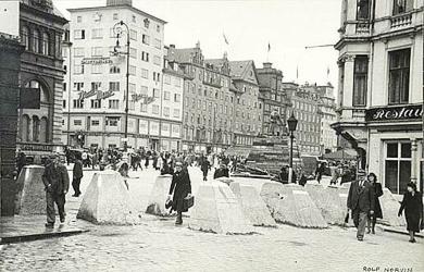 Deler av byen var rammet av krigshandlingene . I flere sentrumsgater var det satt opp tanksperringer, såkalte "Hitlerjeksler" og det var bygd bunkere både i sentrum og langs flere av utfartsårene.