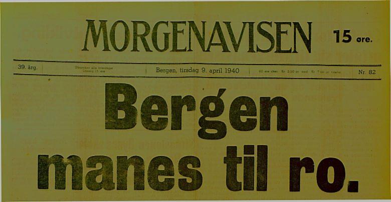Vi har skannet Morgenavisens utgave fra 9. april i sin helhet (avisen kom ut med kun to sider denne dagen), og vi kan her se hvilke overskrifter, opprop og nyheter bergenserne ble servert denne dagen. Vi har også tatt med forsiden til Gula Tidend slik den ble laget for utgivelse 10. april. Avisen ble stanset av den tyske pressesensuren, og avisen la dermed ned driften da den nektet å underkaste seg tysk sensur. Avisutklippet vi ser er hentet fra avisens første nummer da avisen igjen så dagens lys, høsten 1948.