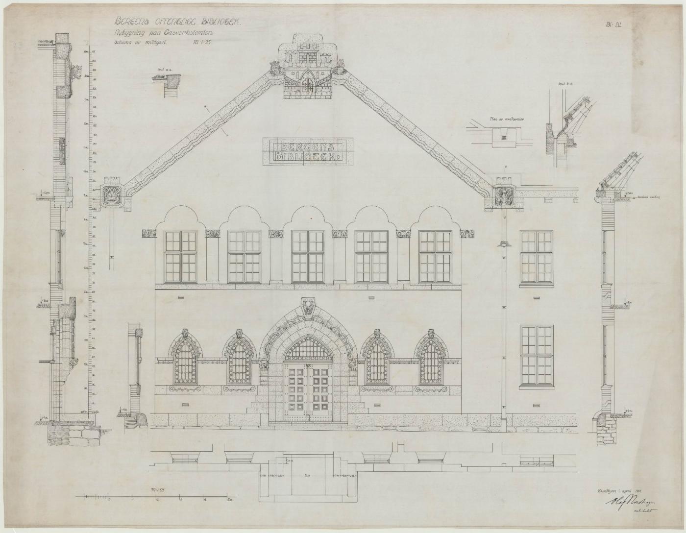 Bergen offentlige bibliotek, Strømgaten 6. Noen av arkitekt Olaf Nordhagens originaltegninger av biblioteket - fasader, planer og detaljer. Signert 1914. Arkivet etter Byggprosjektavdelingen, A-2695, Ta:148.