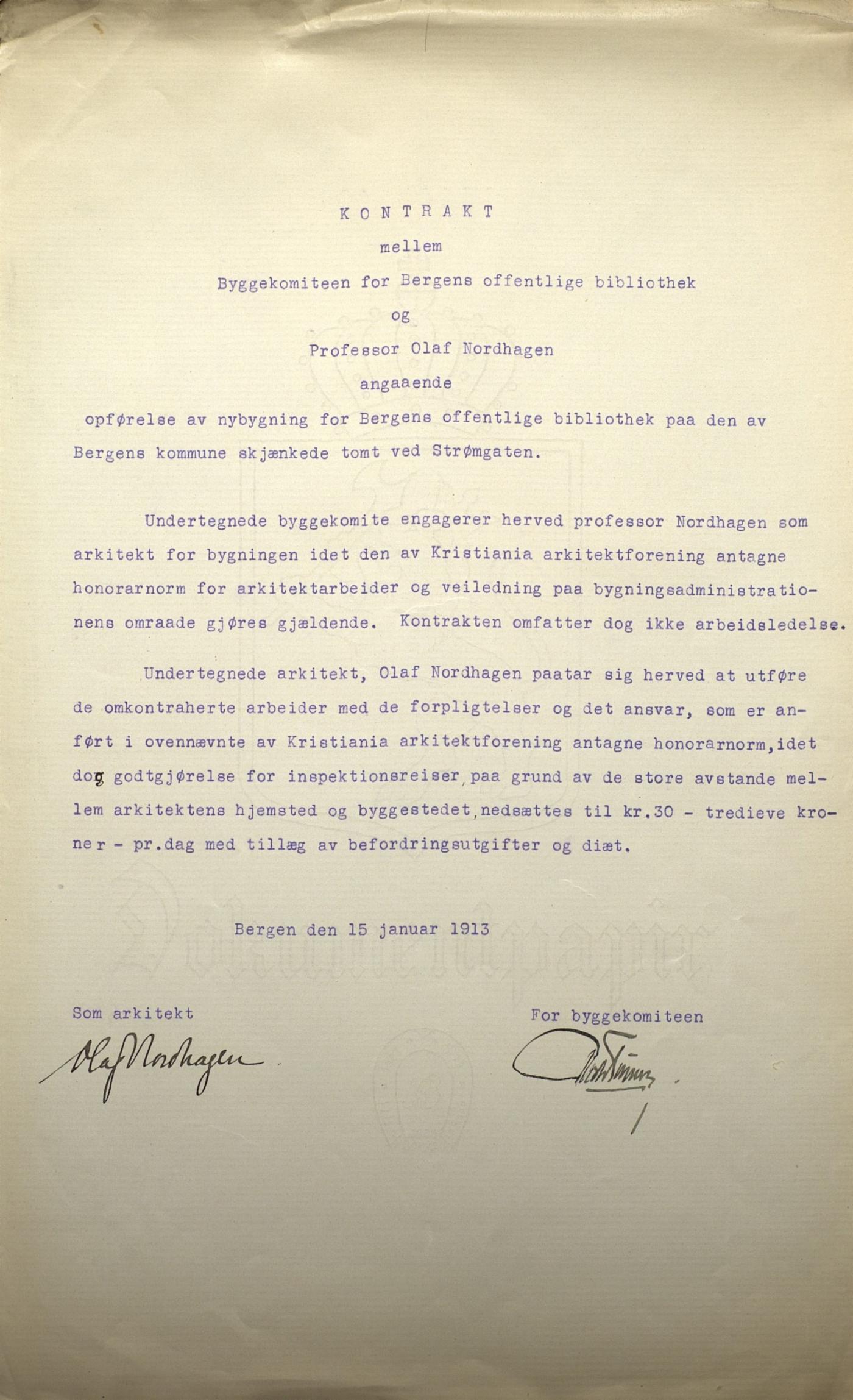 Bergen offentlige bibliotek hadde blitt opprettet i 1872, og fra 1879 holdt det til i på loftet i Kjøttbasaren. Allerede tidlig på 1900-tallet ble det aktuelt med nytt bygg. Det ble nedsatt en komité og man begynte å samle inn penger. Det skulle likevel ta lang tid før bygget sto ferdig. I august 1905 ble det utlyst en arkitektkonkurranse, med frist 1. januar 1906. Fire av utkastene ble premiert og ytterligere to ble innkjøpt. Ingen ble imidlertid funnet fullt ut egnet til å legges til grunn for utførelsen. Det ble derfor kalt inn til en ny begrenset konkurranse blant de beste fra første konkurranse, om utførelsen av bygget, og den ble vunnet av arkitekt Olaf Nordhagen høsten 1906.