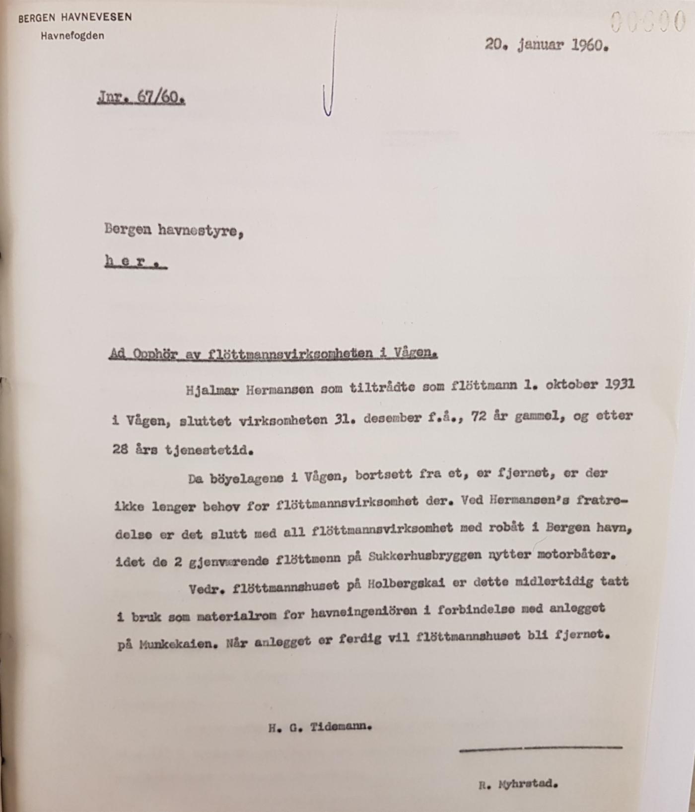 Hermansen var den siste fløttmann med robåt i Bergen, og den siste fløttmann på Vågen. Men fløttmannsvirksomheten var altså ikke helt avviklet med det. Fremdeles var det tre fløttmenn i tjeneste ved Sukkerhusbryggen frem til 31.12. 1968; Kristian Kristiansen, Alfred Skar og Edvard Skar. Og med det var den århundrelange fløttmannsvirksomheten i Bergen over.