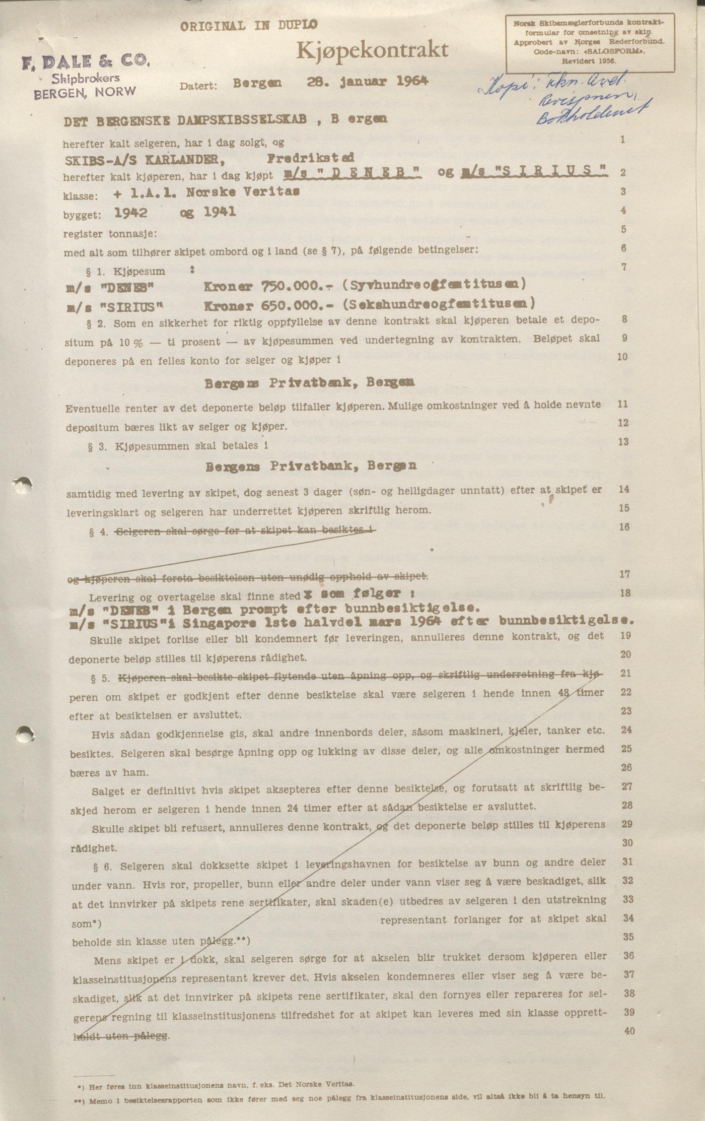 M/S Sirius ble solgt av BDS 28. januar 1964 sammen med søsterskipet M/S Deneb som ble bygd samtidig til Skipsrederiet A/S Karlander (E. Paulsen) i Fredrikstad. I kjøpekontrakten fra 1964 ser at kjøpesummen for M/S Sirius er 650 000 kroner som i dag tilsvarer 8 272 997, og at overtagelsen skulle skje i mars 1964 i Singapore. Dette tyder på at M/S Sirius var ute på havet mens salget fant sted mens M/S Deneb mest sannsynlig var i havn i Bergen siden overtagelsen for M/S Deneb skjedde rett etter bunnbesiktigelsen.