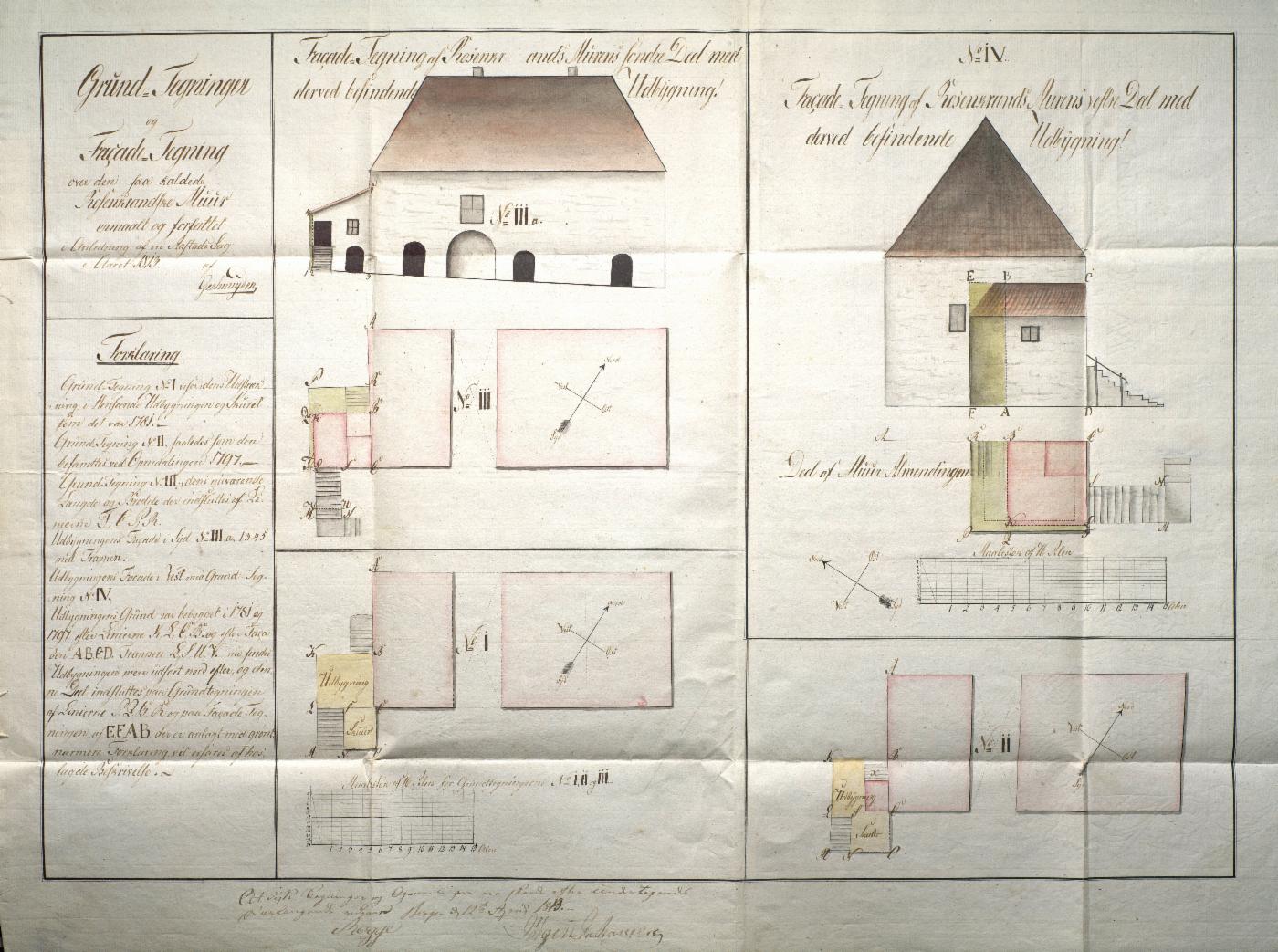 Oppmålingen av Muren ble gjort i forbindelse med en rettssak om en utvidelse av påbygget på vestsiden. Påbygget inneholdt en trapp opp til andre etasje, og var blitt utvidet av eieren og beboeren, Jørgen Johannessen. Det var et problem for byens myndigheter at private stadig bygget på offentlig grunn. Også på slutten av 1790-tallet hadde byen anlagt sak mot alle som hadde bygget ulovlige trapper, gjerder, påbygg og lignende, blant annet på Murallmenningen. Johannesen tapte saken og måtte rive utvidelsen. På denne tegningen har Geelmuyden vist tilbygget i tre faser, i 1781, 1797 og 1813. Fotografiet fra formannskapets arkiv, tatt av Knud Knudsen 50 år senere, i 1865, viser at trappeoppgangen fortsatt sto der, men i dag er den borte.