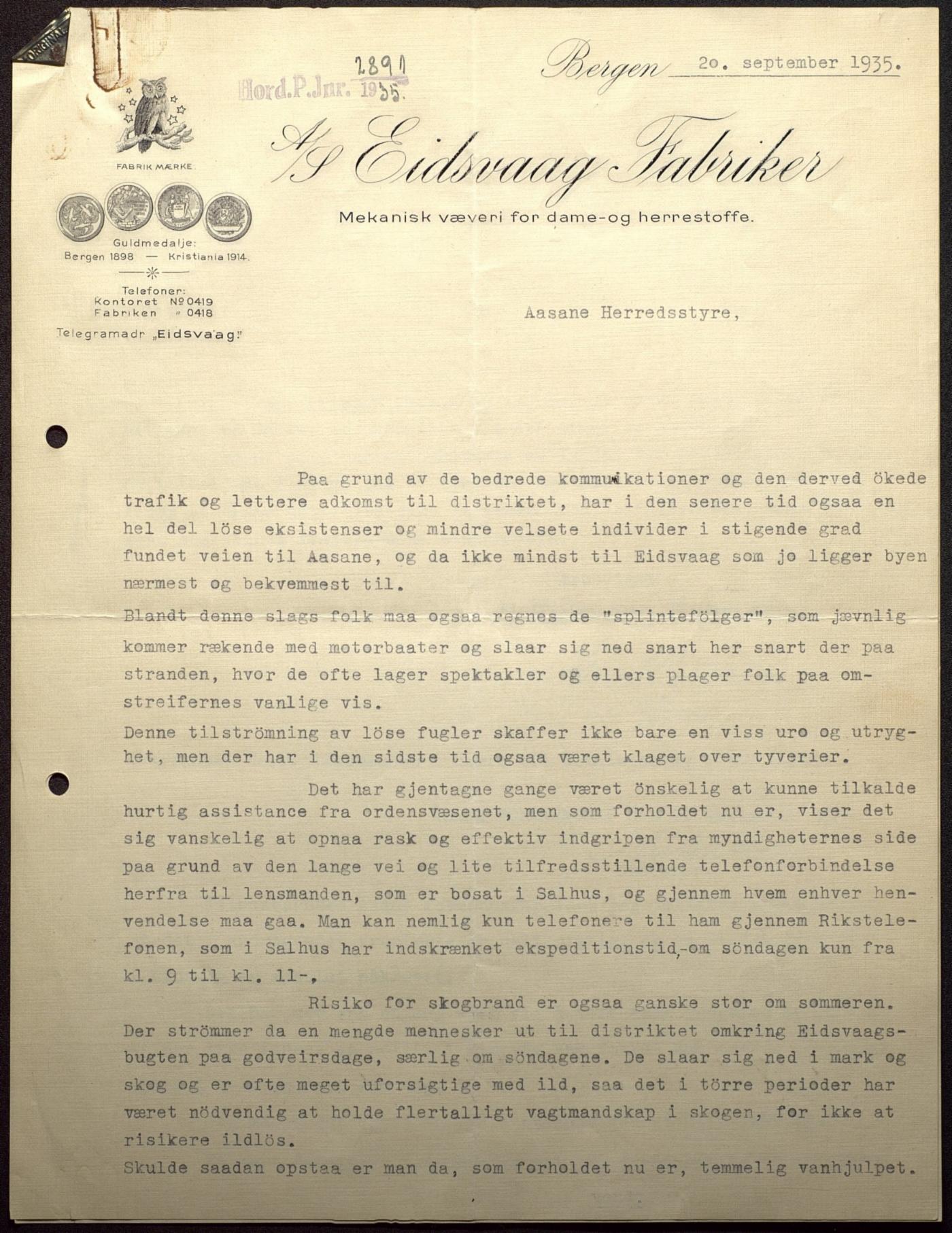 På denne tiden fantes det ikke noe politi i Eidsvåg, og Petersen påpekte at det dermed var vanskelig å oppnå rask og effektiv inngripen fra myndighetens side. Det var lang vei fra lensmannen i Salhus til Eidsvåg, og dessuten var telefonforbindelsene lite tilfredsstillende. Petersen henstilte derfor til herredsstyret om å avhjelpe disse vanskelighetene ved å ansette en politibetjent med fast bopel i Eidsvåg.