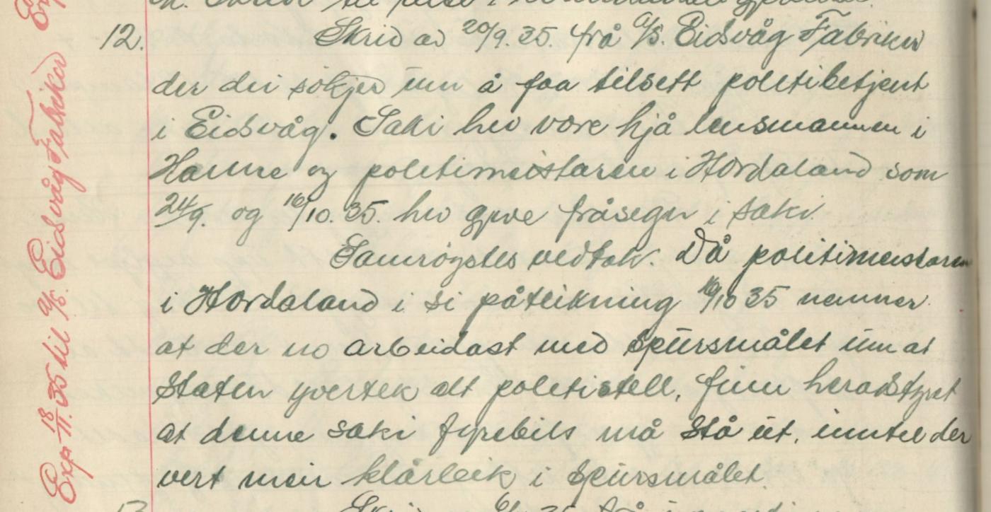 Formannskapets neste skritt var å videresende brevet til Politimesteren i Hordaland, blant annet for å undersøke om man kunne regne med statsstøtte for avlønning av en politibetjent i Eidsvåg.
