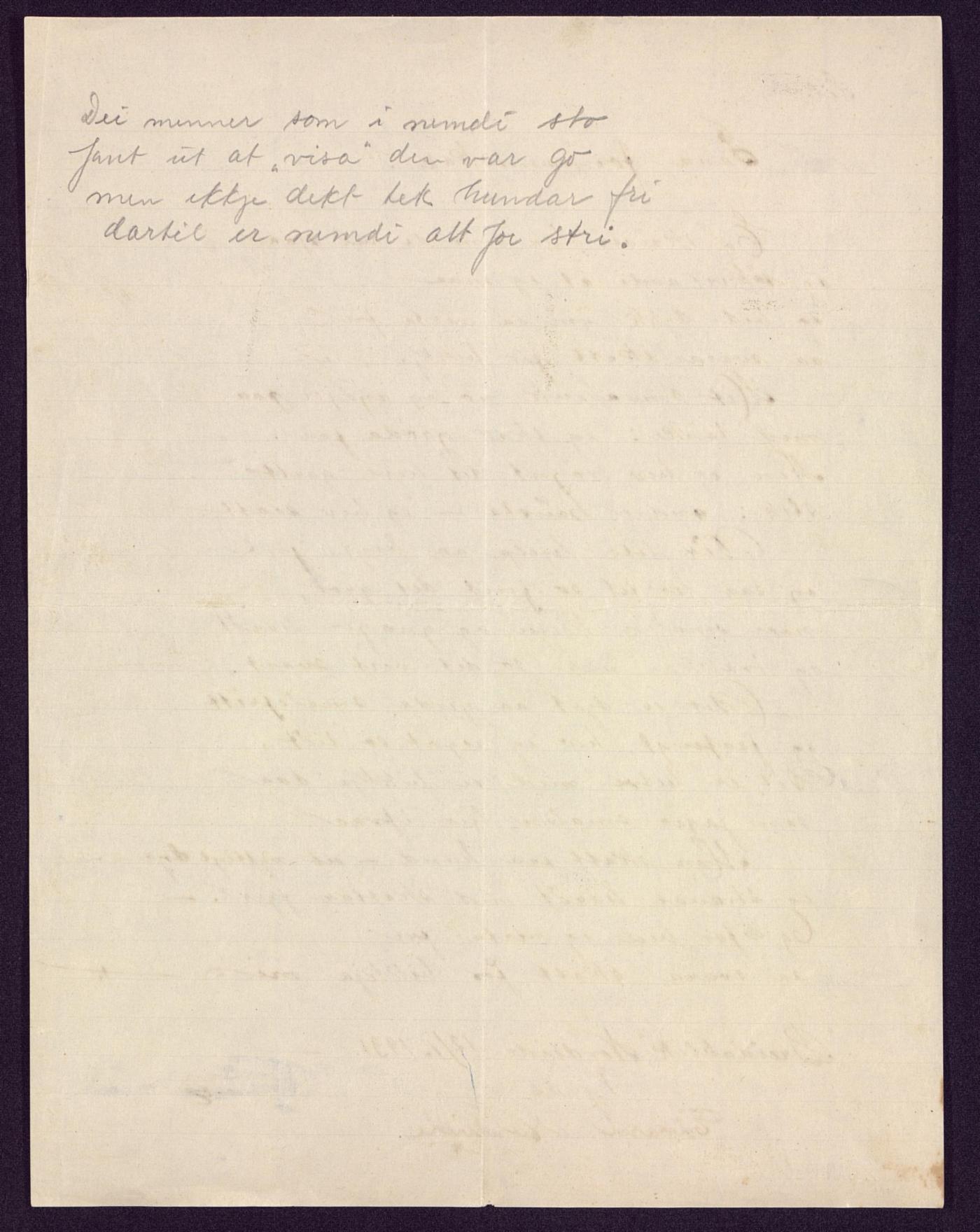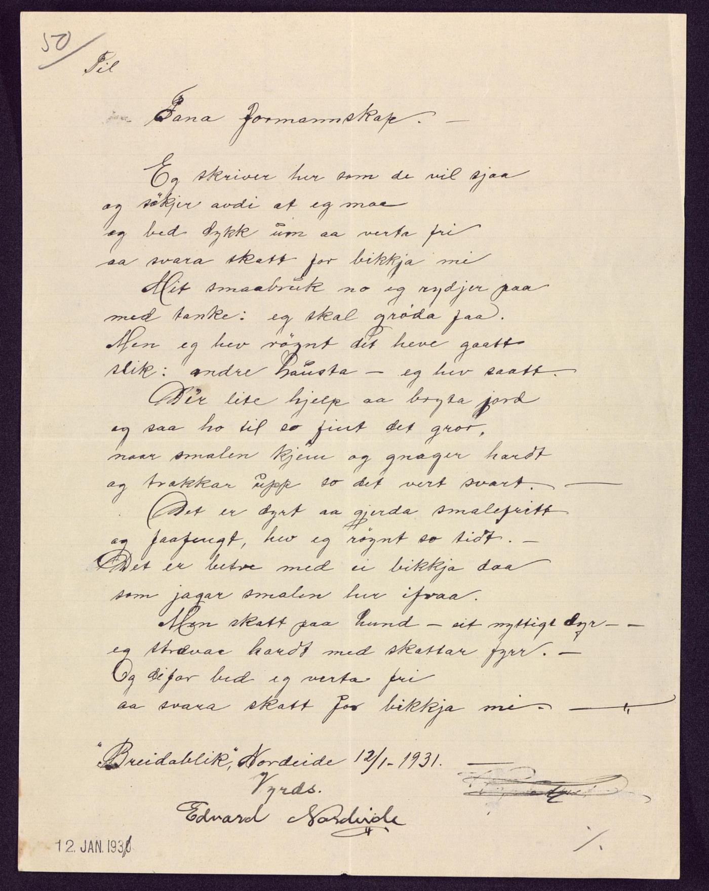 I januar 1931 sendte Edvard Nordeide i Fana en søknad til Fana formannskap om å bli fritatt for hundeskatt. Han mente han burde få fritak når han trengte hunden til å holde sauene borte fra småbruket sitt, og sendte søknaden på rim, med fem vers. Men det var ikke bare Edvard som kunne dikte, for avslaget fra kommunen står på baksiden av brevet – også det på rim!