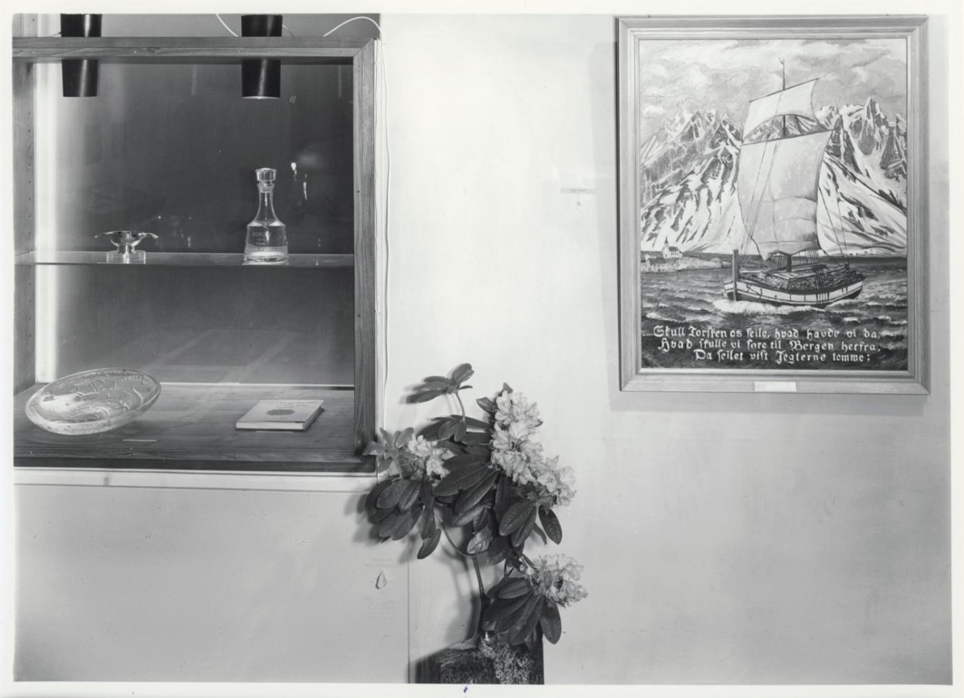 Maleriet av Nordlandsjekte med Petter Dass sine ord: «Skull torsken os feile, hvad havde vi da. Hvad skulde vi føre til Bergen herfra. Da sejlet visst Jegterne tomme», var en gave fra Vågan kommune. Til venstre diverse gaver. Fotograf Jan H. Reimers, 1970. Arkivet etter Byjubileumskomiteen.