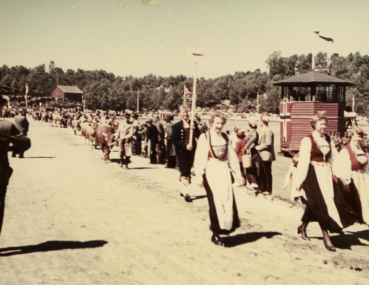 På utstillingsplassen var det flere underholdningsinnslag. Divisjonsmusikken bidro med hornmusikk, og bunadskledde barn hadde oppvisning. Premierte dyr ble samlet i sine klasser for fremvisning, og foran hver klasse gikk det bunadskledde ungdommer med navneskilt for klassen. Et slikt opptog ser en på fotoet som er månedens foto.