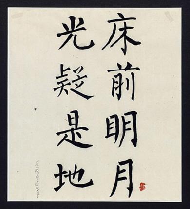 Kalligrafien er utført av en elev ved Lynghug skole i Fyllingsdalen og uttrykker hjemlengsel, et kinesisk ordtak.