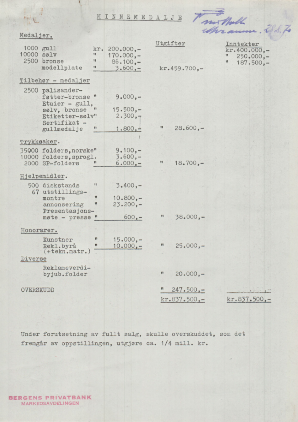 Det ble tidlig klart at 900-årsjubileet i Bergen i 1970 måtte avstedkomme en minnemedalje. Det ble nedsatt et utvalg som konsulterte byens banker vedrørende samarbeid om produksjon og markedsføring, for når medaljer selges gjennom en bank, heves produktets prestisje. Bankene var positive, mot at fortjenesten på salget ble brukt til utsmykning av byen i jubileumsåret. Skulle prosjektet gå med tap, ville bankene dekke det inn.