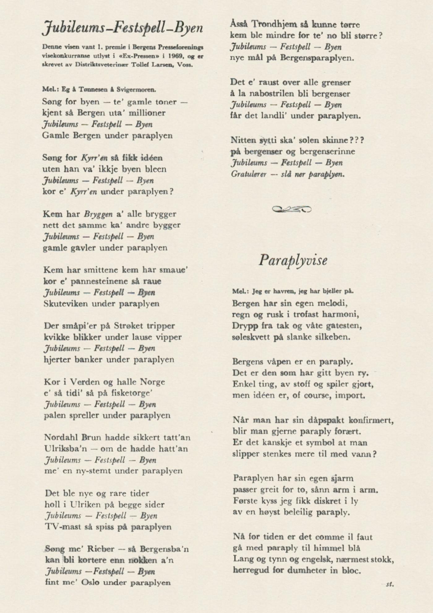 På paradedagen toget altså tusenvis av bergensere med oppslåtte paraplyer i alle slags farger og fasonger fra Festplassen og gjennom byens gater i beste syttendemai-stil, for til sist å ende opp sammen med tilskuerne ved scenen på Torgalmenningen. Der spilte Lungegaarden musikkorps dobbel jubileumsfanfare, mens ti buekorpsgutter fra Skansen bataljon trommet opp til paraplyeksersis, og kommanderte hele Torgalmenningen med i eksersisen med paraplyen som "våpen". 900 barn prydet folkemengden med hver sin jubileumsballong. Konferansierer for dagen var Jakob Skarstein og Rolf Valeur, og de fikk etter hvert selskap av Rune Larsen, som sang buekorpsvise og strilevise. Deretter ble det bergensviser med Norma og Malvin Myhre. Underveis kåserte Finn Bjørn Tønder over hva en paraply kunne brukes til.