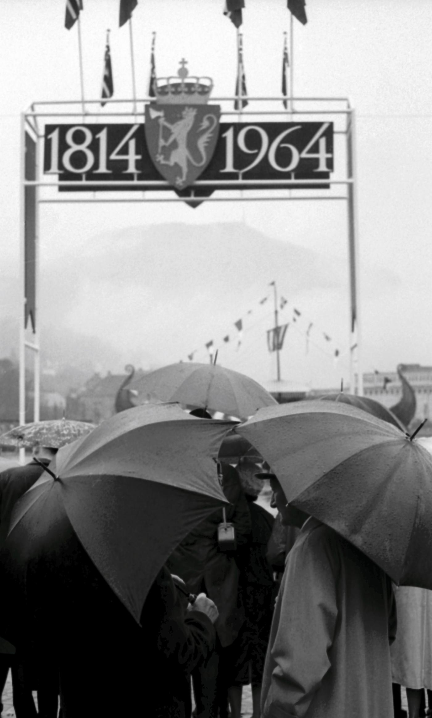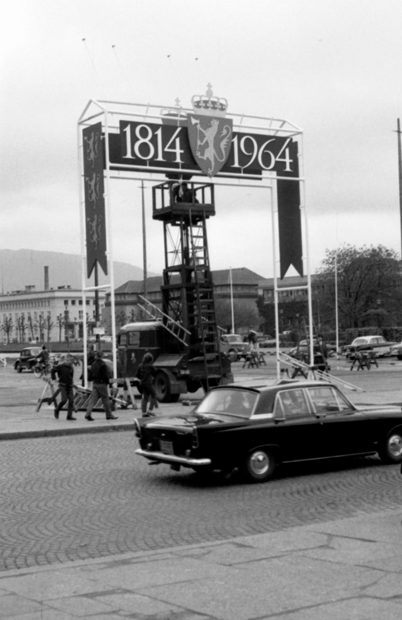 Fotoet av 150 års jubileums-buen ble publisert i spalten «Byen» 16. mai 1964. Bildet ble ledsaget av teksten. «Denne portalen pryder inngangen til Festplassen. Den ble satt på plass av store kranvogner i går». Kranbilen kan ses bak buen. Flaggene som ble festet i toppen like før 17. mai var ennå ikke montert. Triumfbuen hadde reisverk i metall, og var prydet med bannere med Norges riksvåpen, og årstallene 1814-1964.