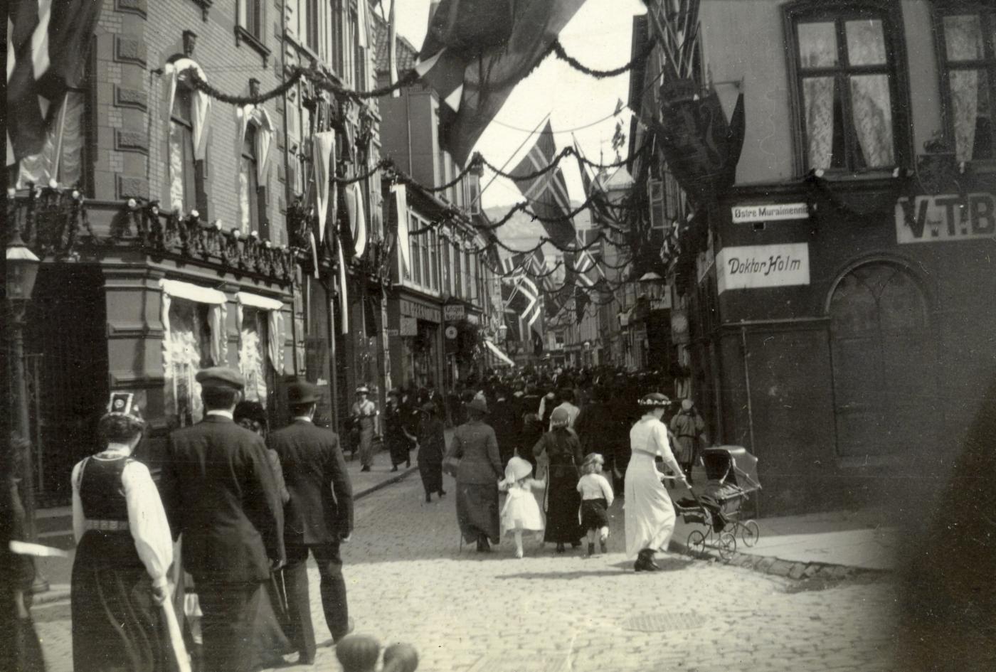 Jubileumsfeiringen var i det store og hele svært vellykket. Været var best tidlig på dagen, men det regnet nå ikke. Arrangementene trakk uvanlig mange deltakere, og dekorasjonene ble lagt merke til. Triumfbuen på Torget gjorde mest ut av seg, og folk strømmet til for å se den. Noen fotograferte den også, bl.a. den ukjente fotografen som tok dette fotoet som er månedens dokument for mai 2014.